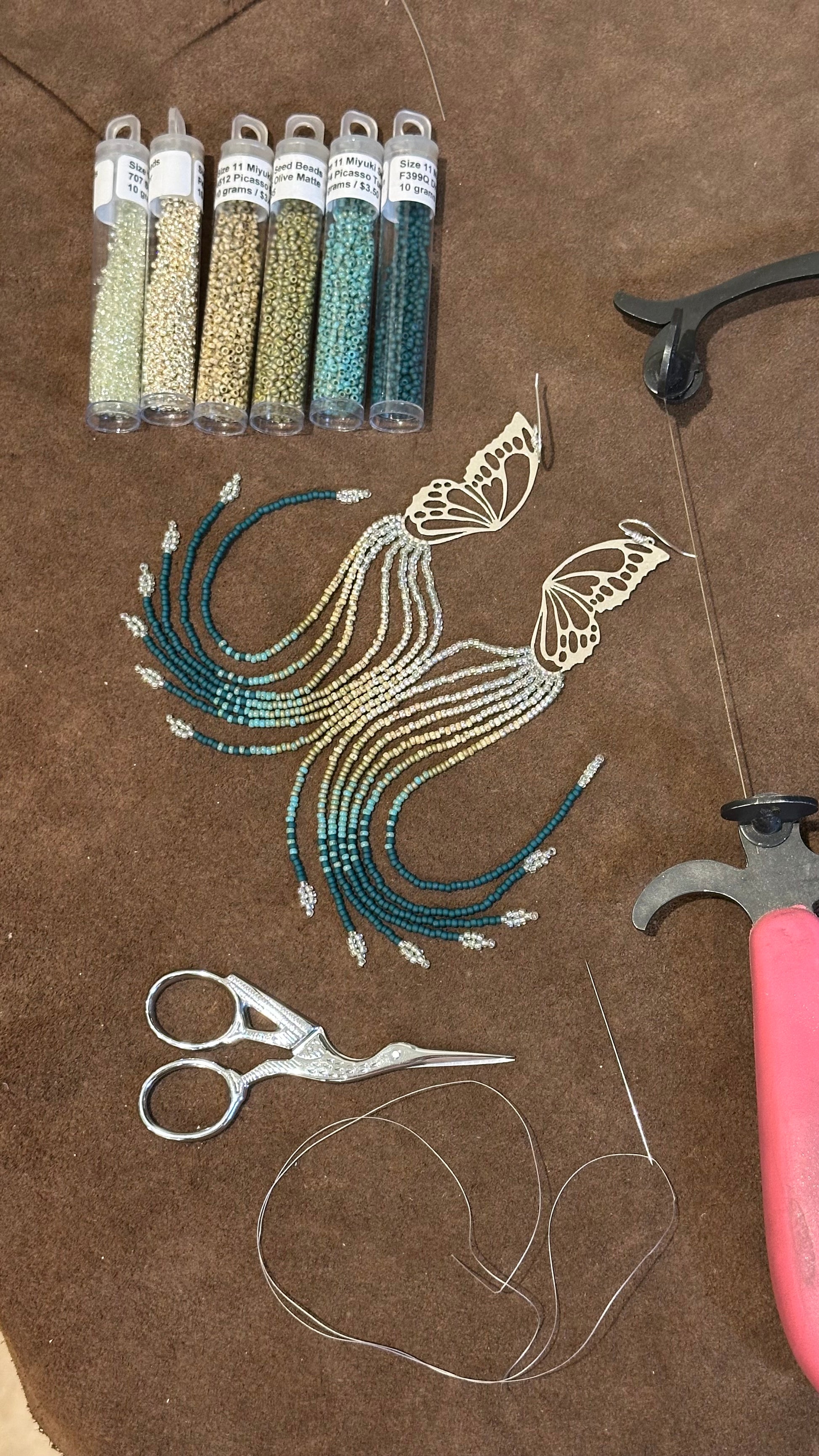 Flutter, flit and fly... These Mariposa loooong shoulder dusters are quite the showstoppers. Handsawn butterfly wings adorned with trailing ombre beaded fringe. Silver, cream, celery, olive, turquoise and peacock blue gradate adding drama and are finished off with silver petal shaped ends. The swing and sway is similar to a flitting butterfly.