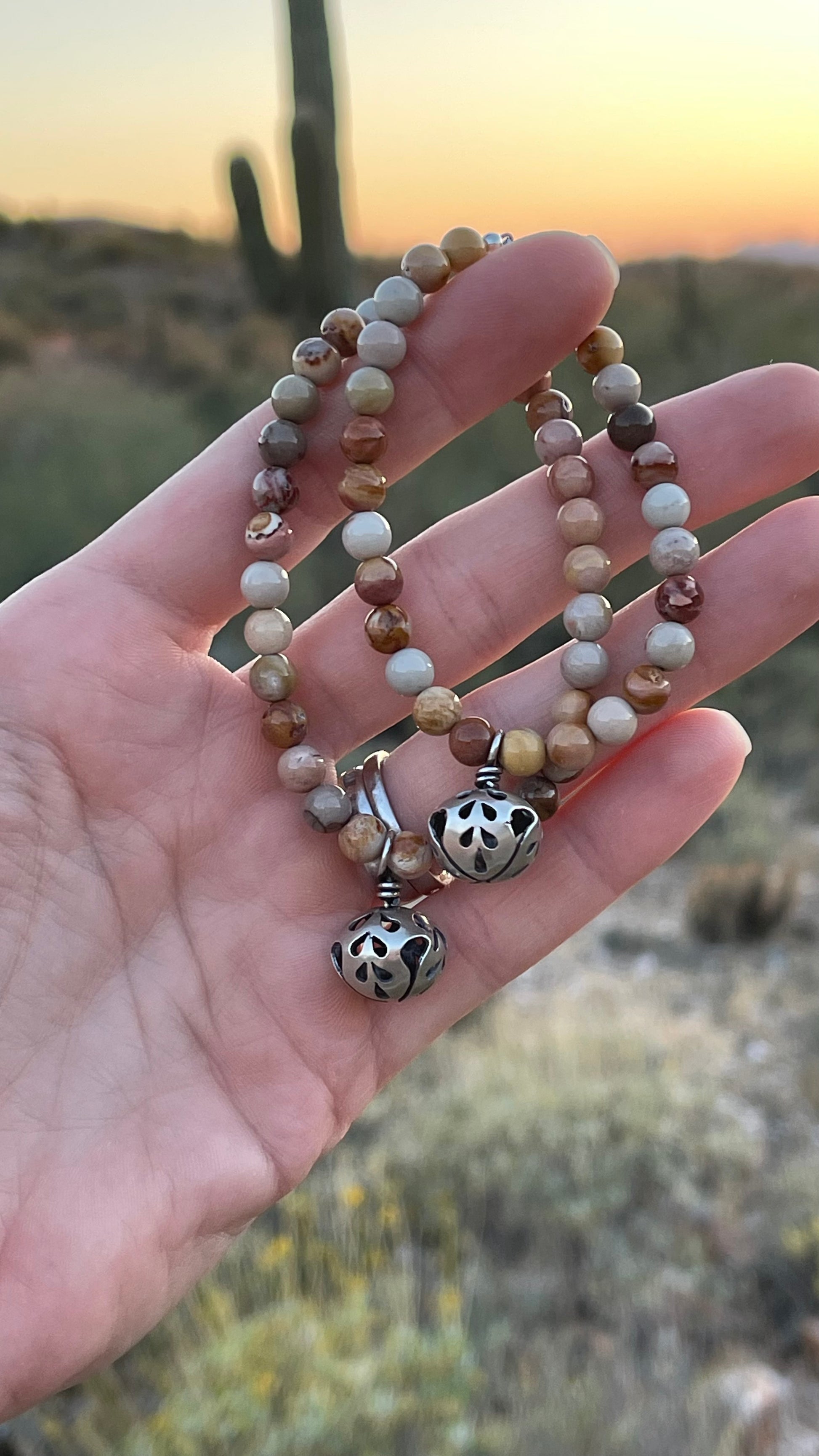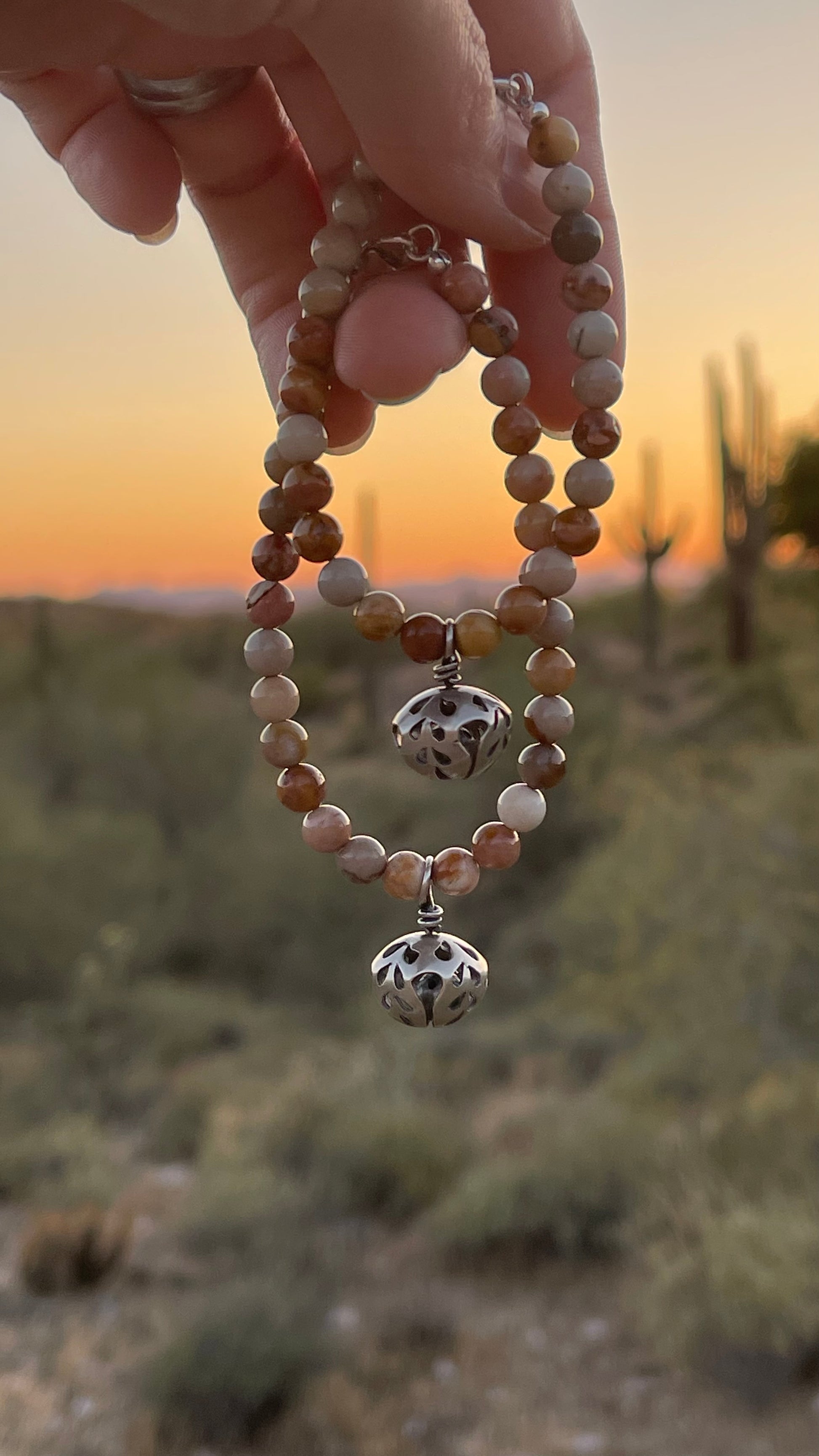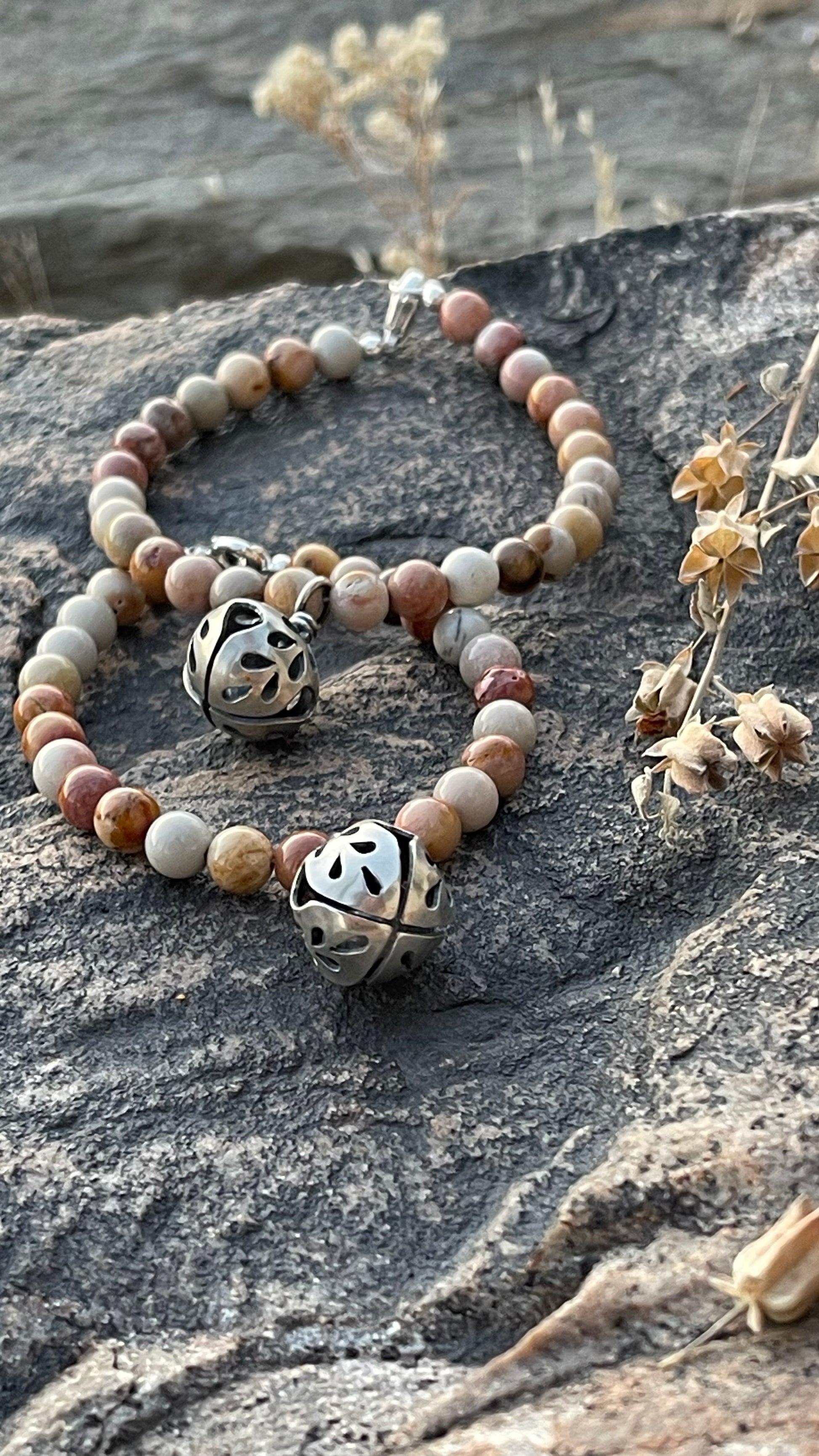 These beads are Hidden Valley Jasper found in Idaho. This gorgeous stone is said to enhance one’s strength, balance, and connection to the earth. The unique energy of this stone promotes stability, grounding, and overall well-being.