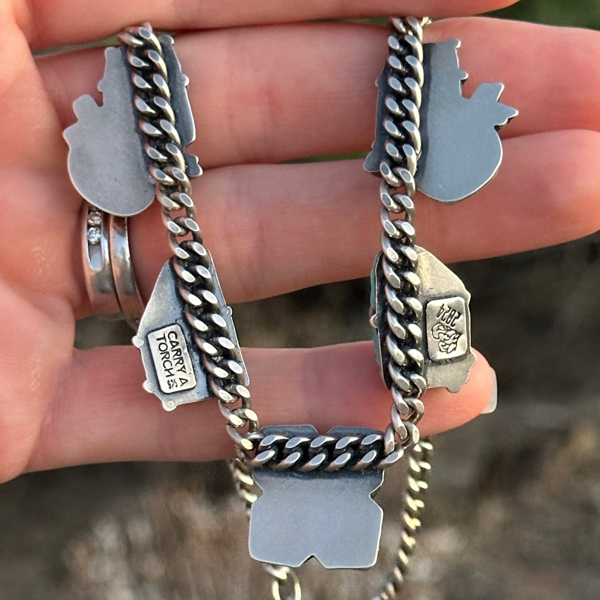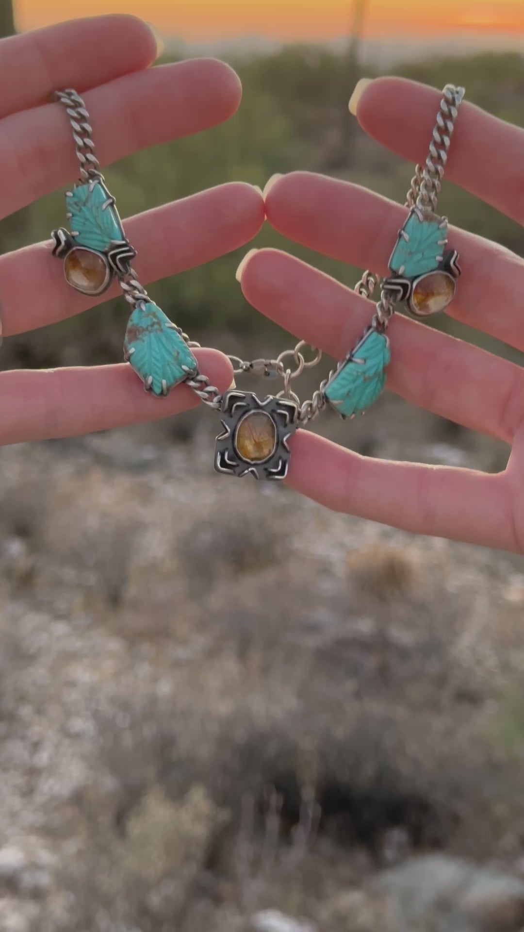 Spectacular Carved Kingman Turquoise + Faceted Brandy Citrine with handcrafted arrow accents come together in this southwest inspired choker necklace. A curb chain ties the individual elements together and is a substantial base making this a very comfortable statement necklace to wear that lays nicely. There are added links giving this choker a range of sizing options for varying neck sizes. From 14.5" to 15.5".