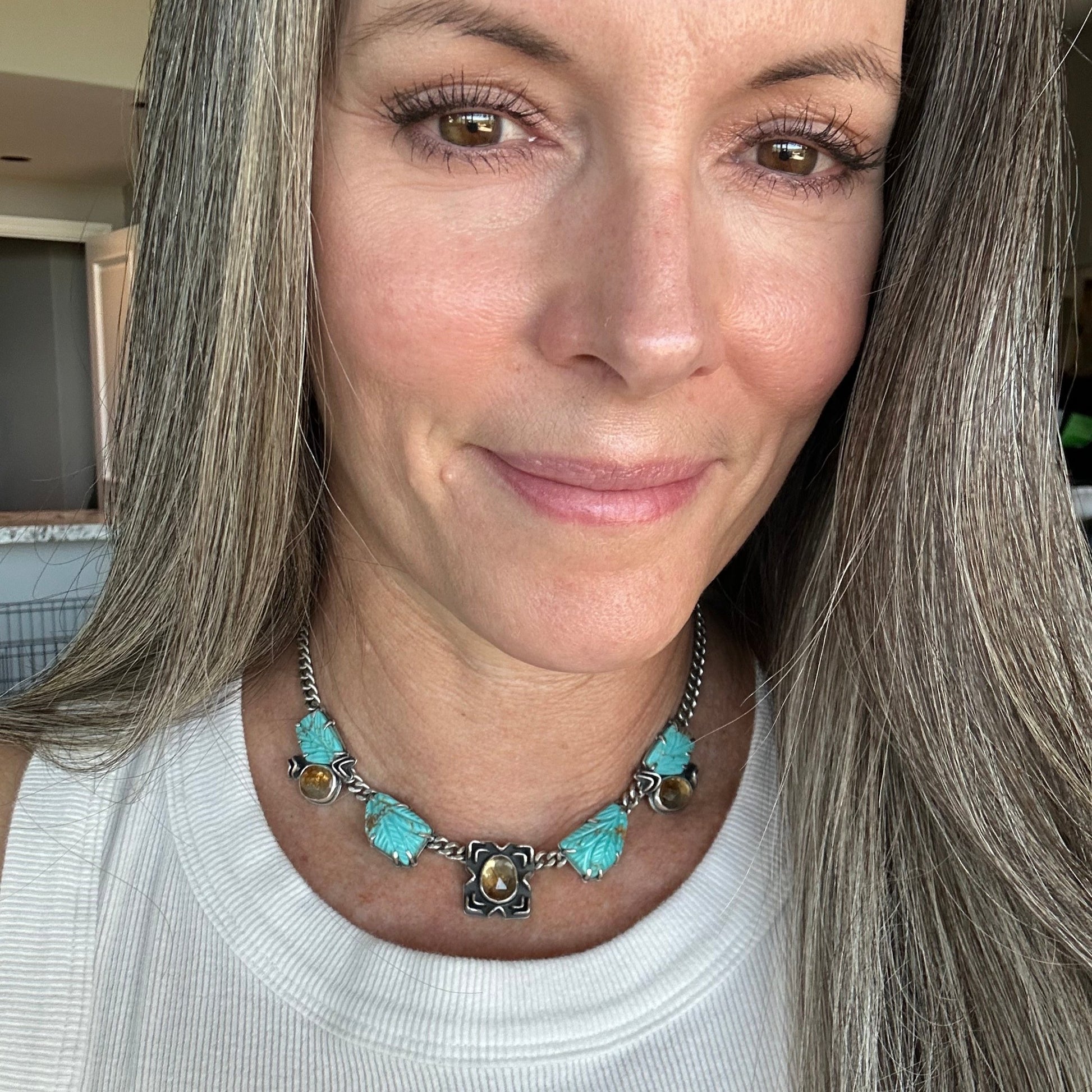 It was love at first sight with these carved turquoise cabochons. I just knew they needed to be showcased in a spectacular fashion. These statement chokers draw attention and accent a look like no other piece I have created before.