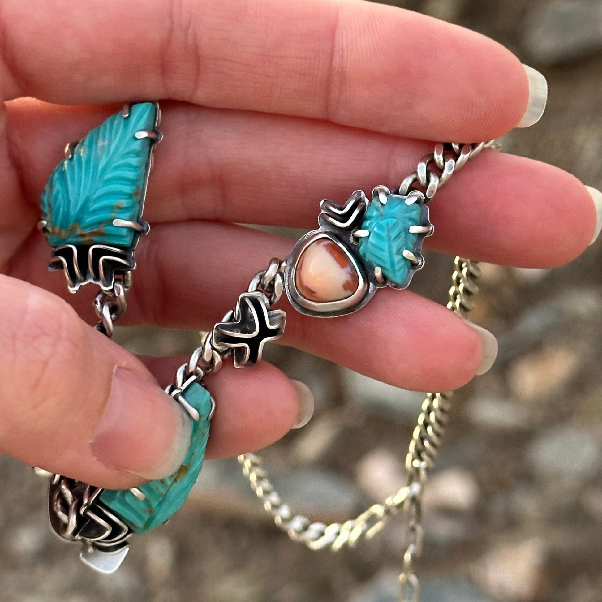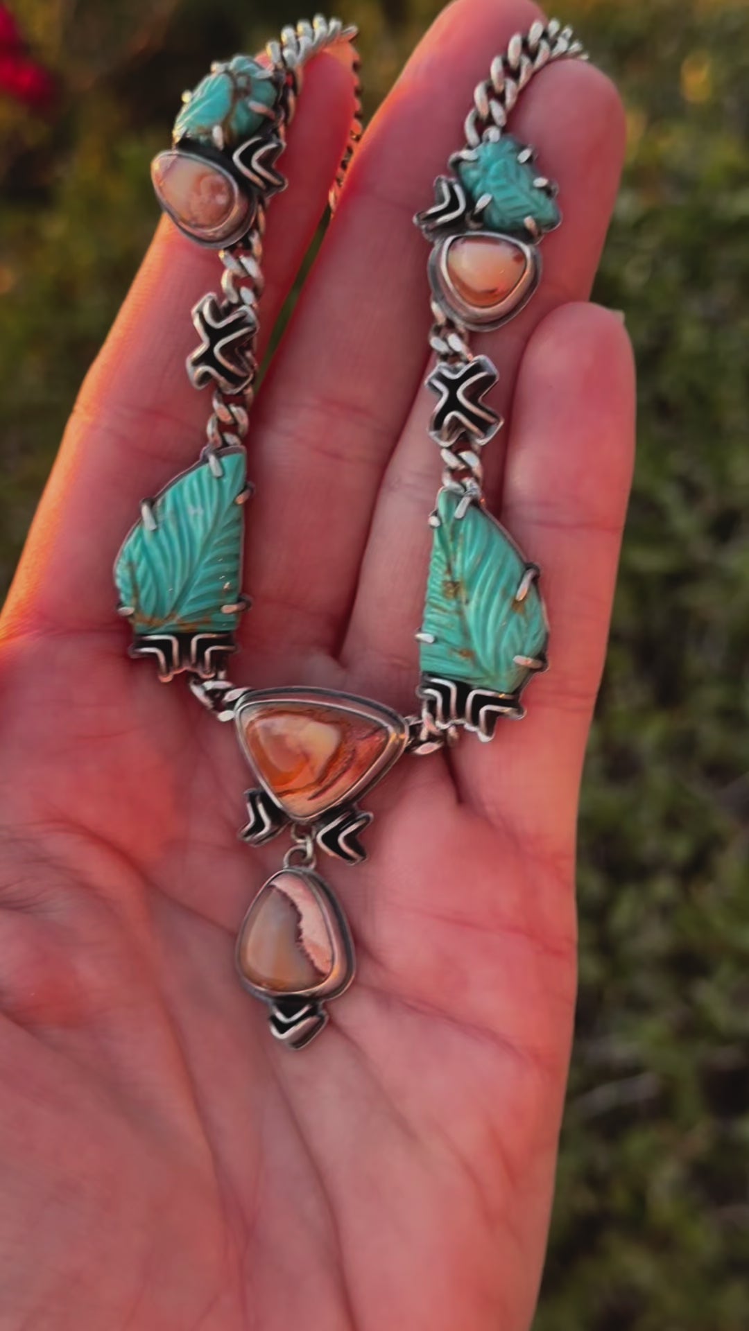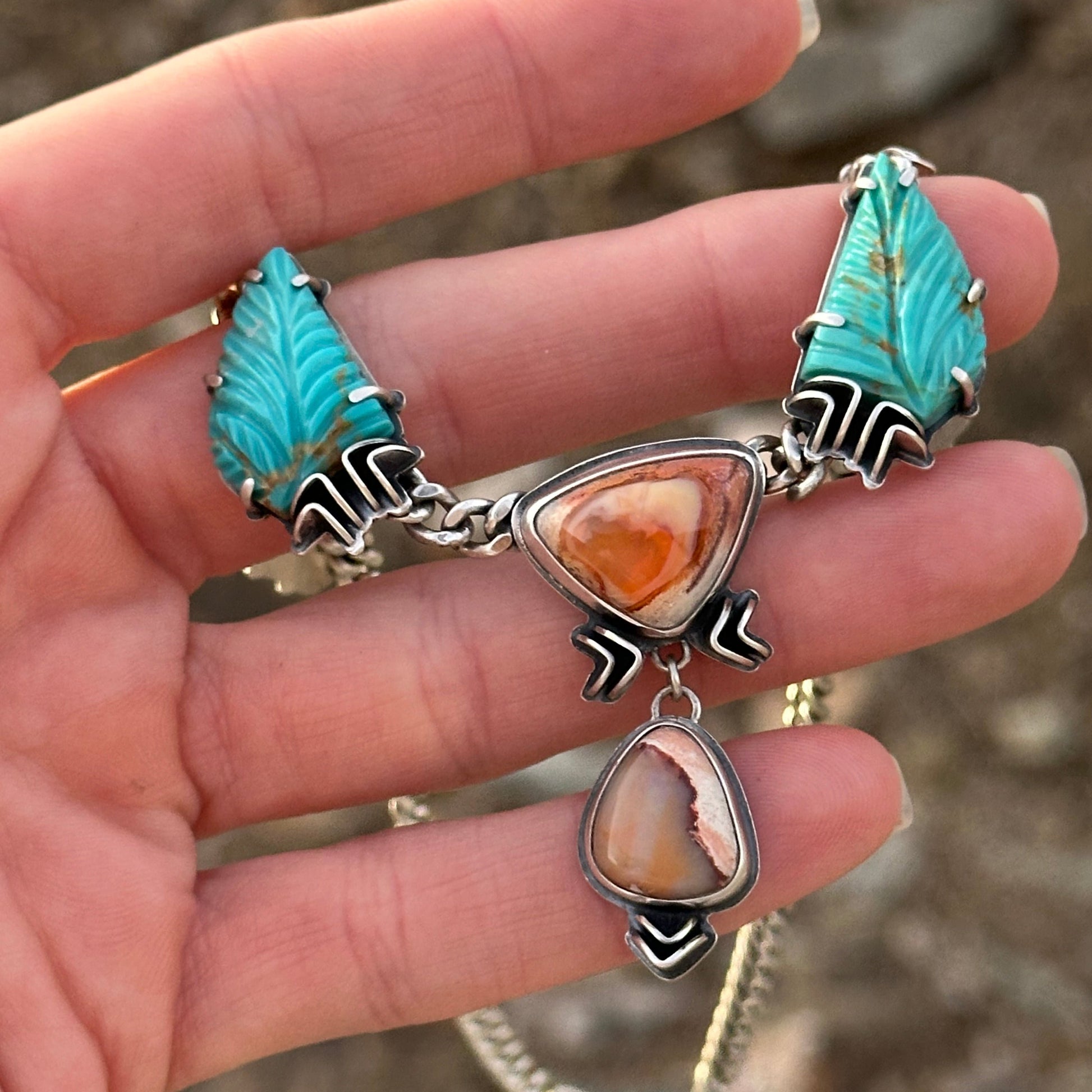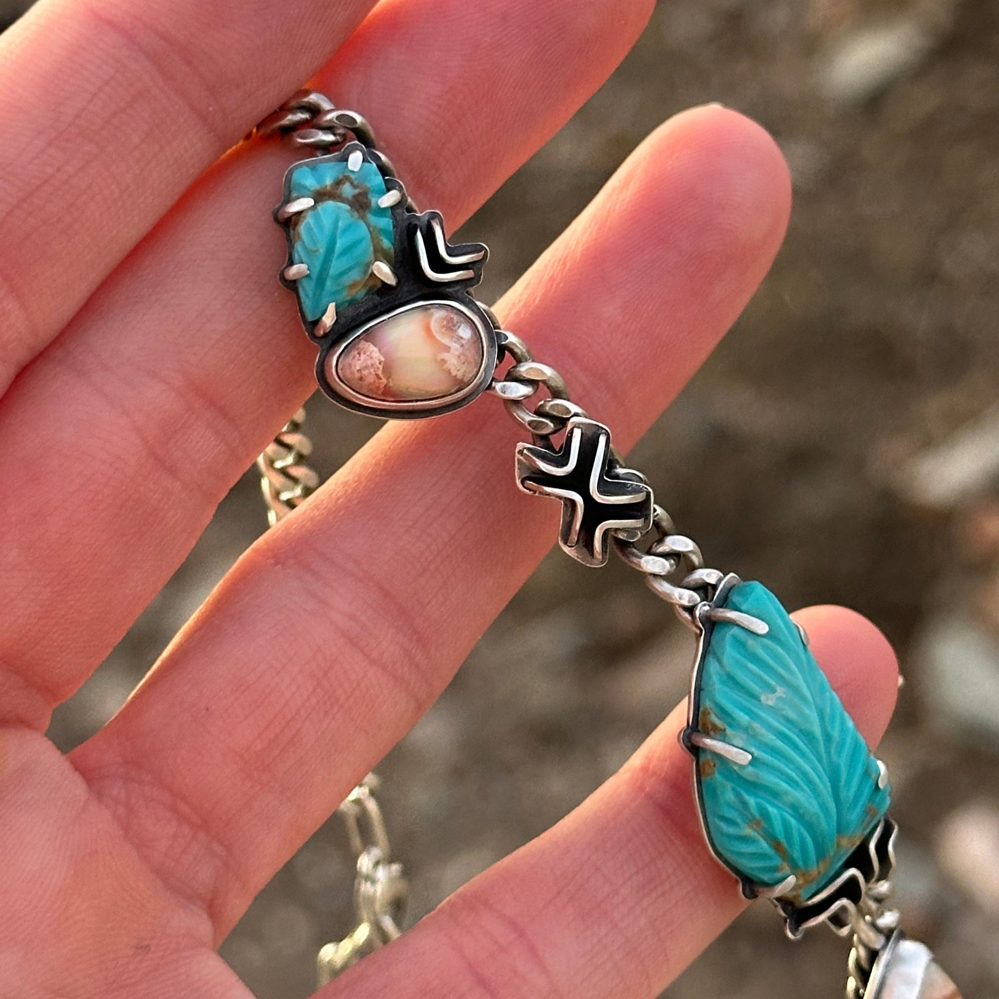 Spectacular Carved Kingman Turquoise + Sparkly Cantera Opal (aka. Mexican Fire Opal) with handcrafted arrow accents come together in this southwest inspired choker necklace. A curb chain ties the individual elements together and is a substantial base making this a very comfortable statement necklace to wear that lays nicely. There are added links giving this choker a range of sizing options for varying neck sizes. From 14.625" to 16".