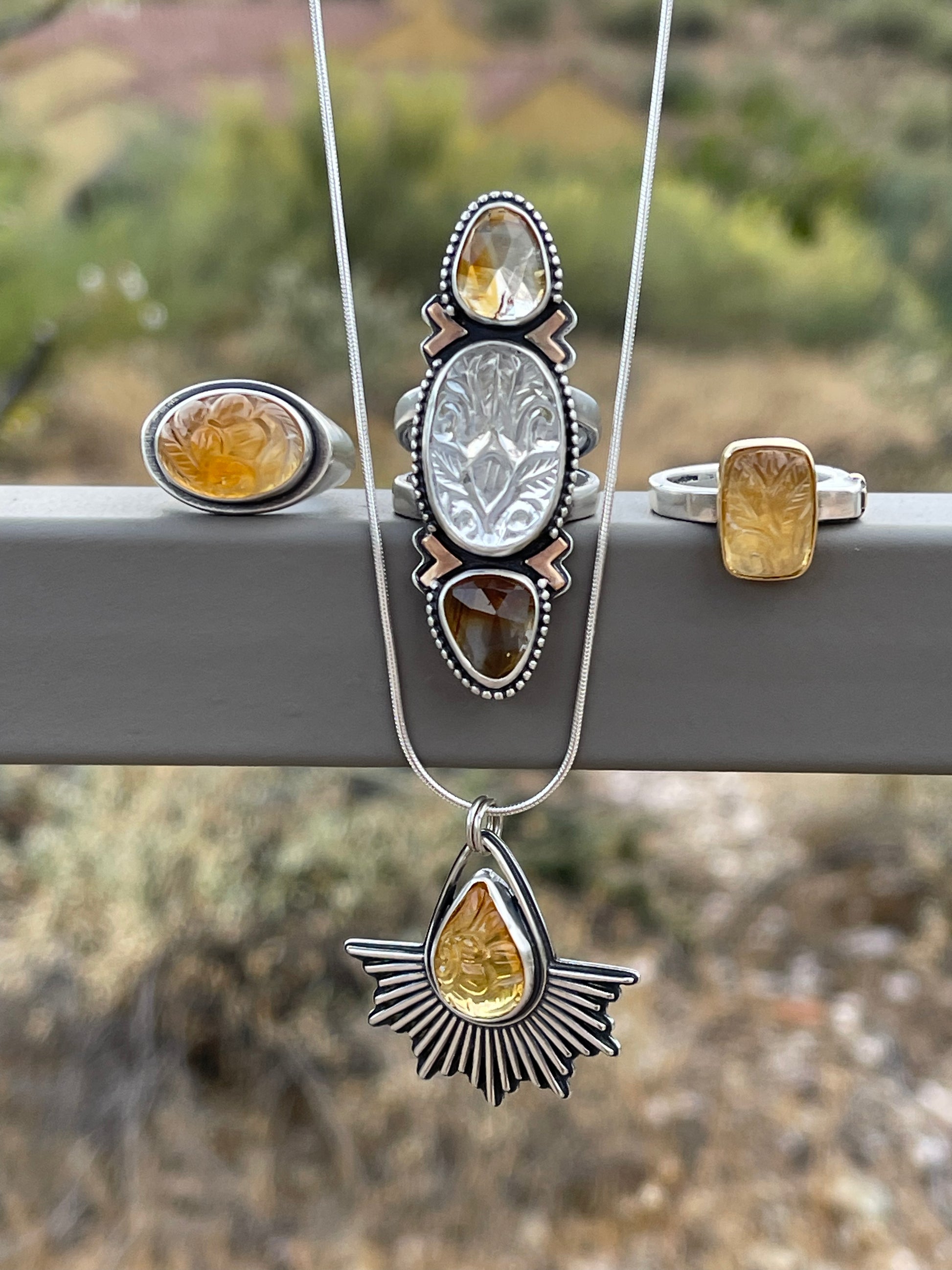I’ve been playing with mixed metals in this collection a bit and I feel this piece benefits the most from this design choice. That polished brass bezel and cross (or plus symbol) really help the carved citrine POP 🌟. Using brass and polishing it up real good can be an affordable option when you want the gold look but don’t want to pay the gold price.