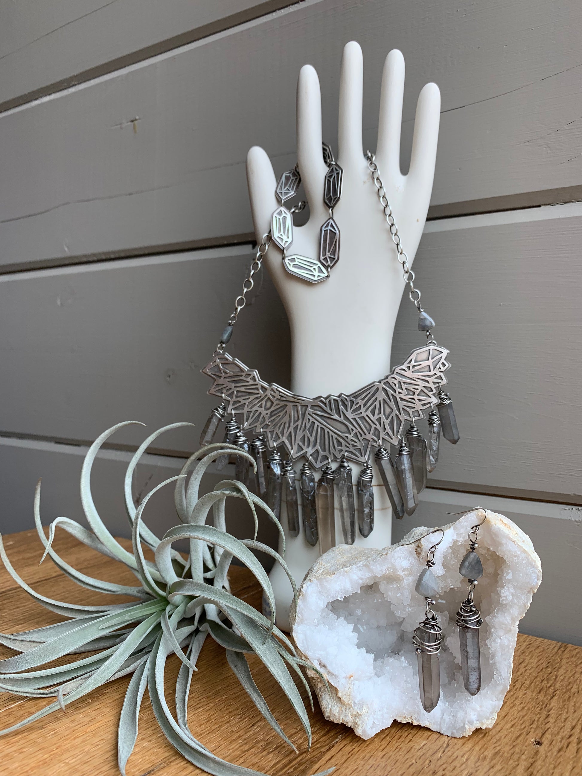 This elegant bib statement necklace emphasizes the beauty in the growth of crystal clusters. Hand sawed sterling cluster design with an array of dangling grey crystal quartz points. It hangs from a sterling silver chain with 4 grey Silverite triangle beads - one on each end of the chain. Lobster claw closure.