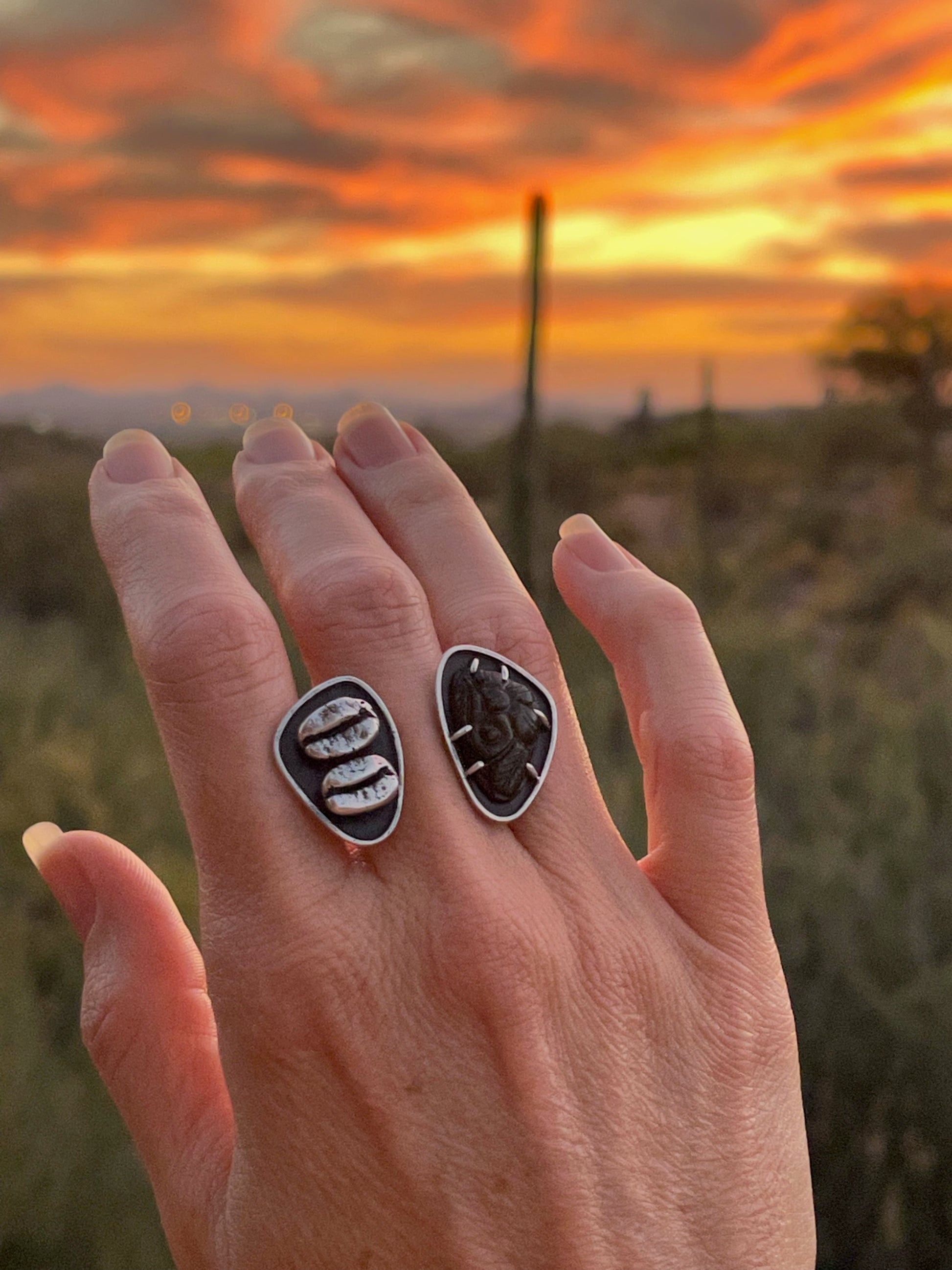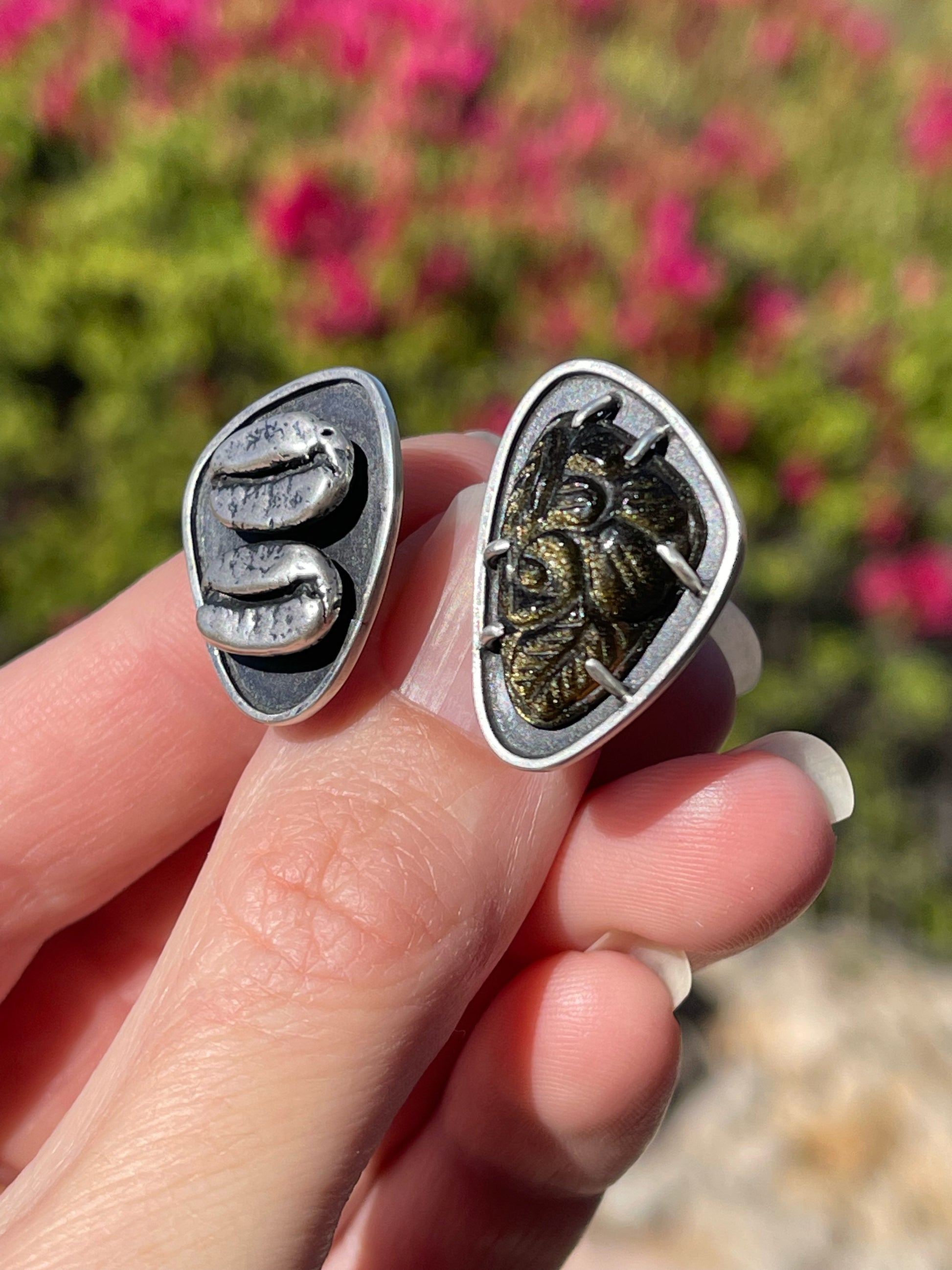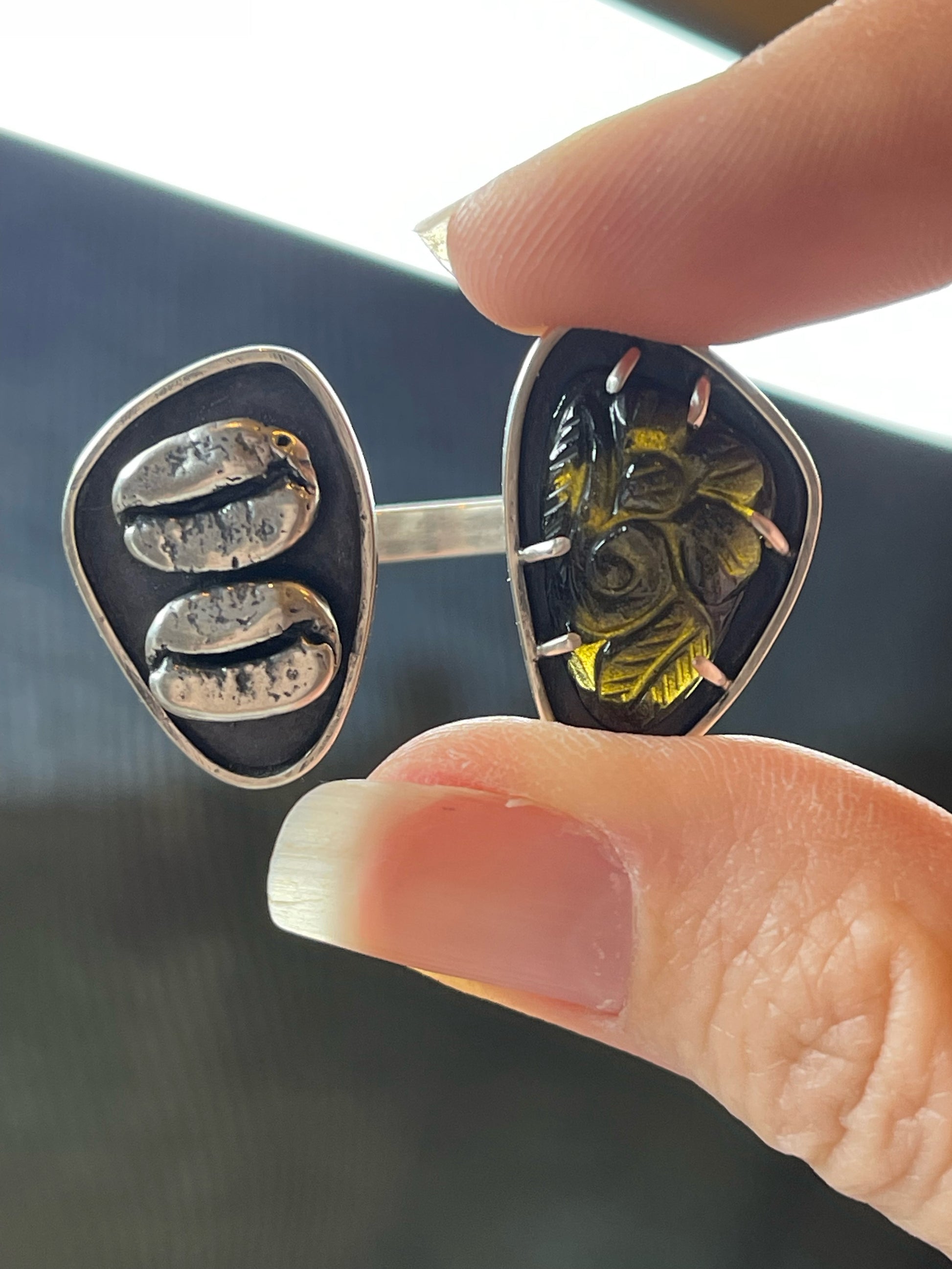 One half of this fun ring features a prong set Mughal-style carved Golden Sheen Obsidian while the other half has a sterling silver pair of coffee beans that were cast from the real thing. The golden sheen obsidian is quite a sight. It glistens and shimmers in the light and can look black, brown and even a greenish depending on the lighting. Both sides of this ring are created in a shadowbox style with a thin border. An added little bonus for the wearer is a cutout on the back side of an Italian coffee pot. This allows light to shine through the stone to better show off that sparkle. A true one-of-a-kind!