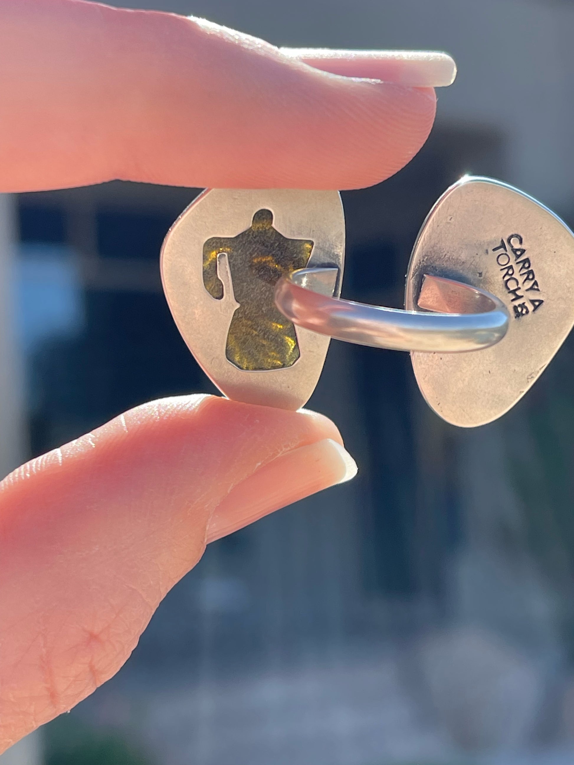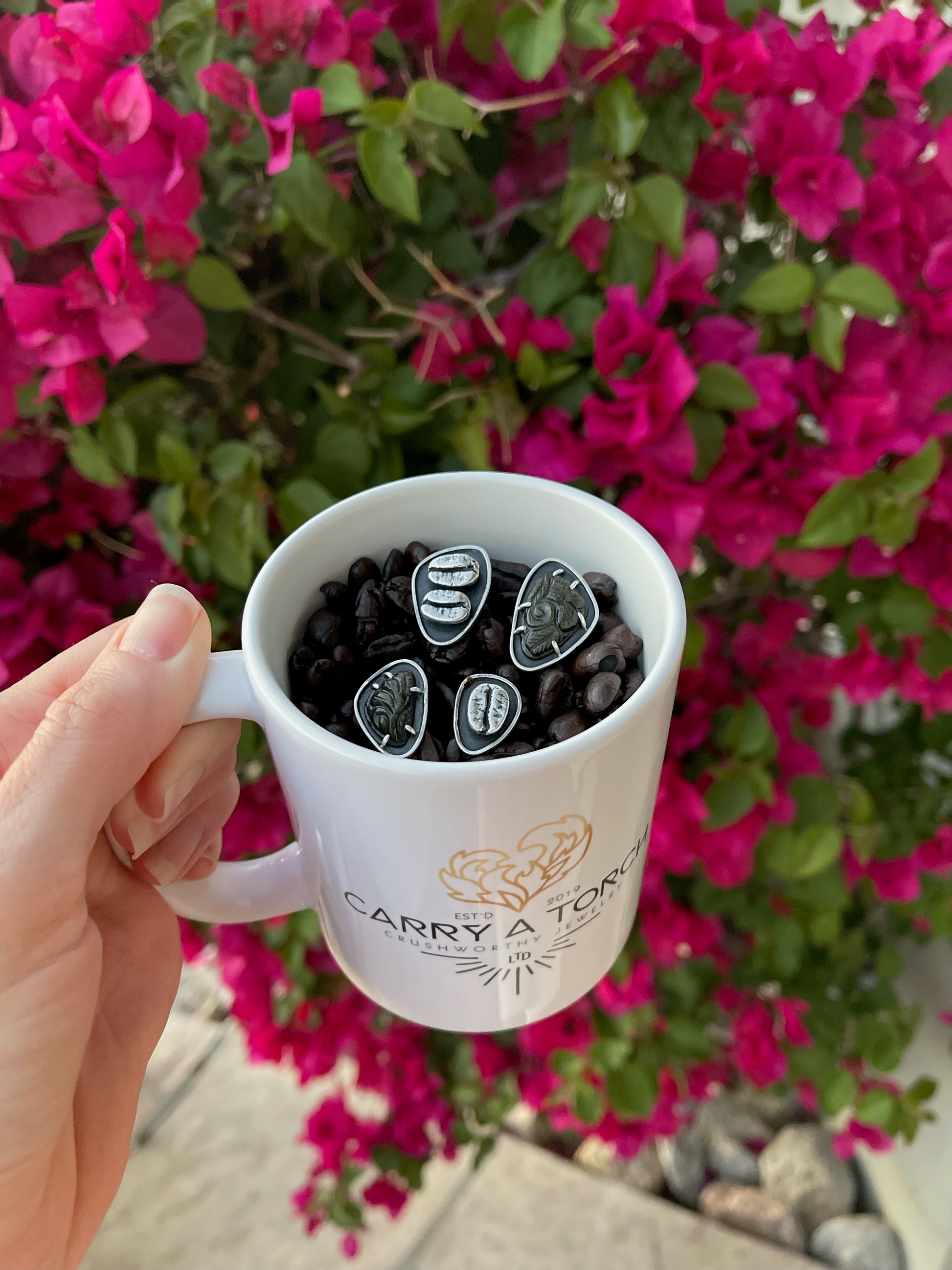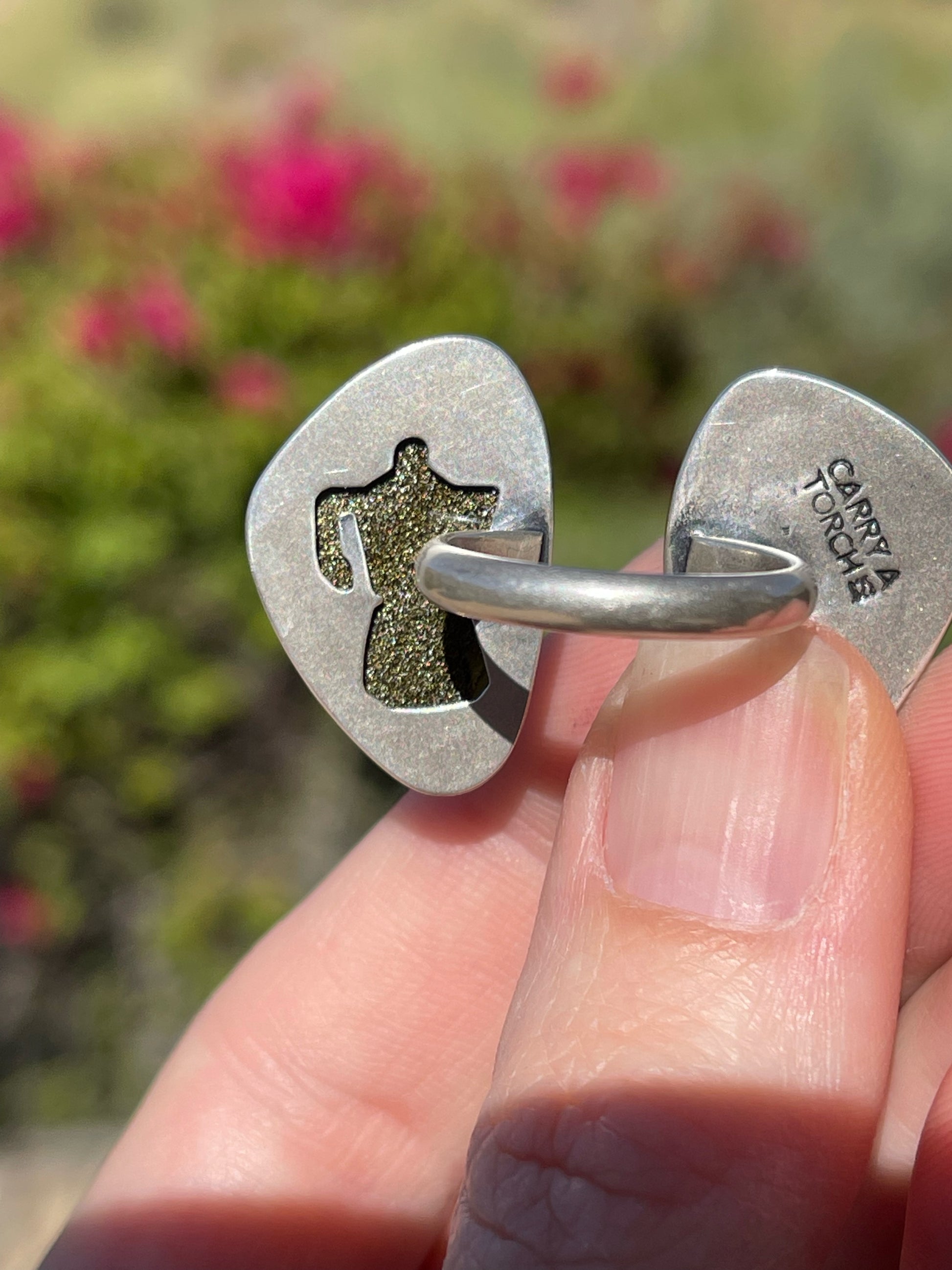 One half of this fun ring features a prong set Mughal-style carved Golden Sheen Obsidian while the other half has a sterling silver pair of coffee beans that were cast from the real thing. The golden sheen obsidian is quite a sight. It glistens and shimmers in the light and can look black, brown and even a greenish depending on the lighting. Both sides of this ring are created in a shadowbox style with a thin border. An added little bonus for the wearer is a cutout on the back side of an Italian coffee pot. This allows light to shine through the stone to better show off that sparkle. A true one-of-a-kind!