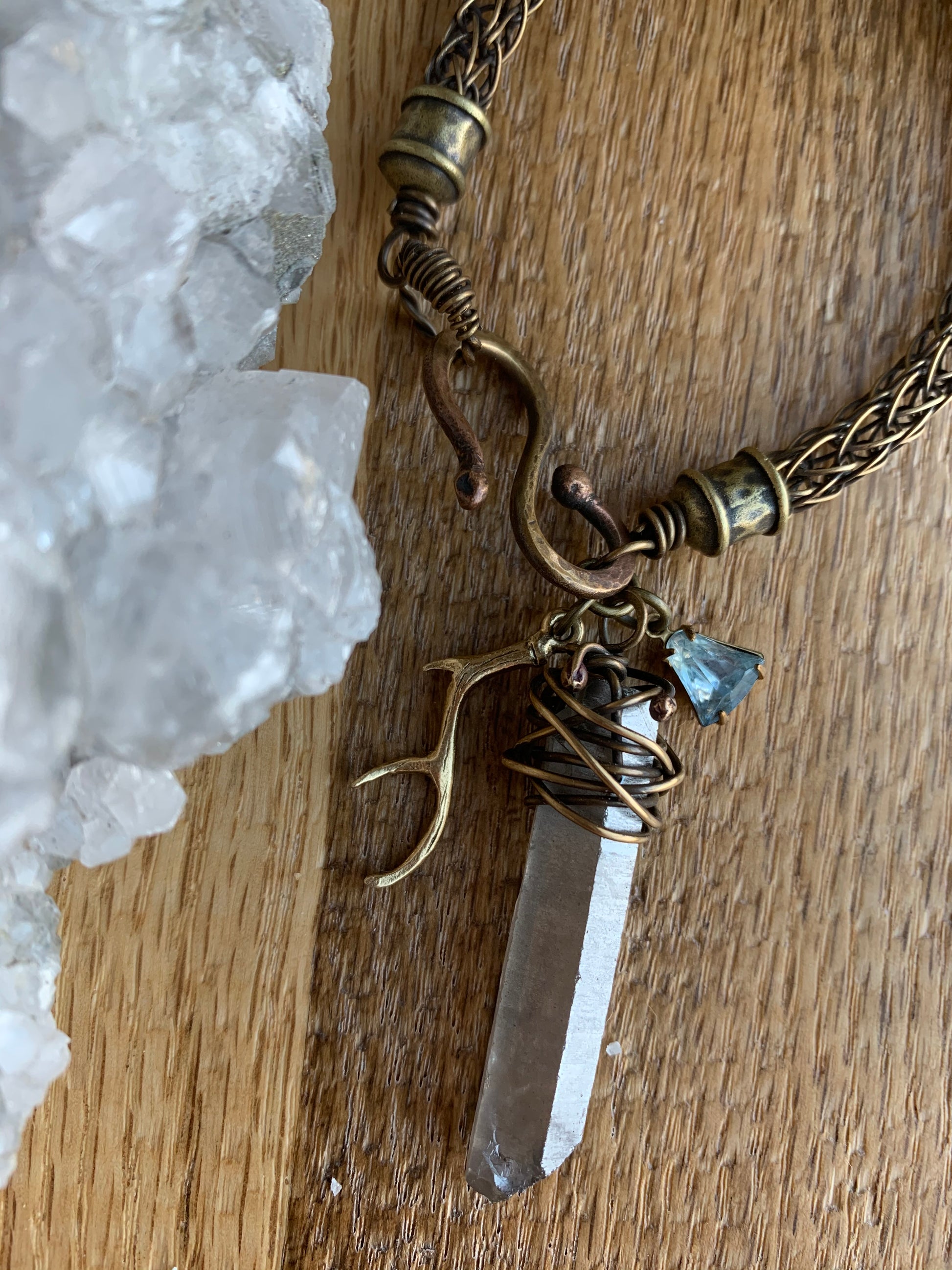 For this bracelet I wanted to create a design that had a bohemian flair with more of a current feel while celebrating and highlighting an ancient technique. I utilized this knit chain that I created with brass wire, capped it in brass end caps and embellished it with a hand forged brass hook, a wire wrapped crystal quartz point, an antler charm and a vintage aqua charm. It is eye catching and full of fabulous texture and lovely dangly elements.