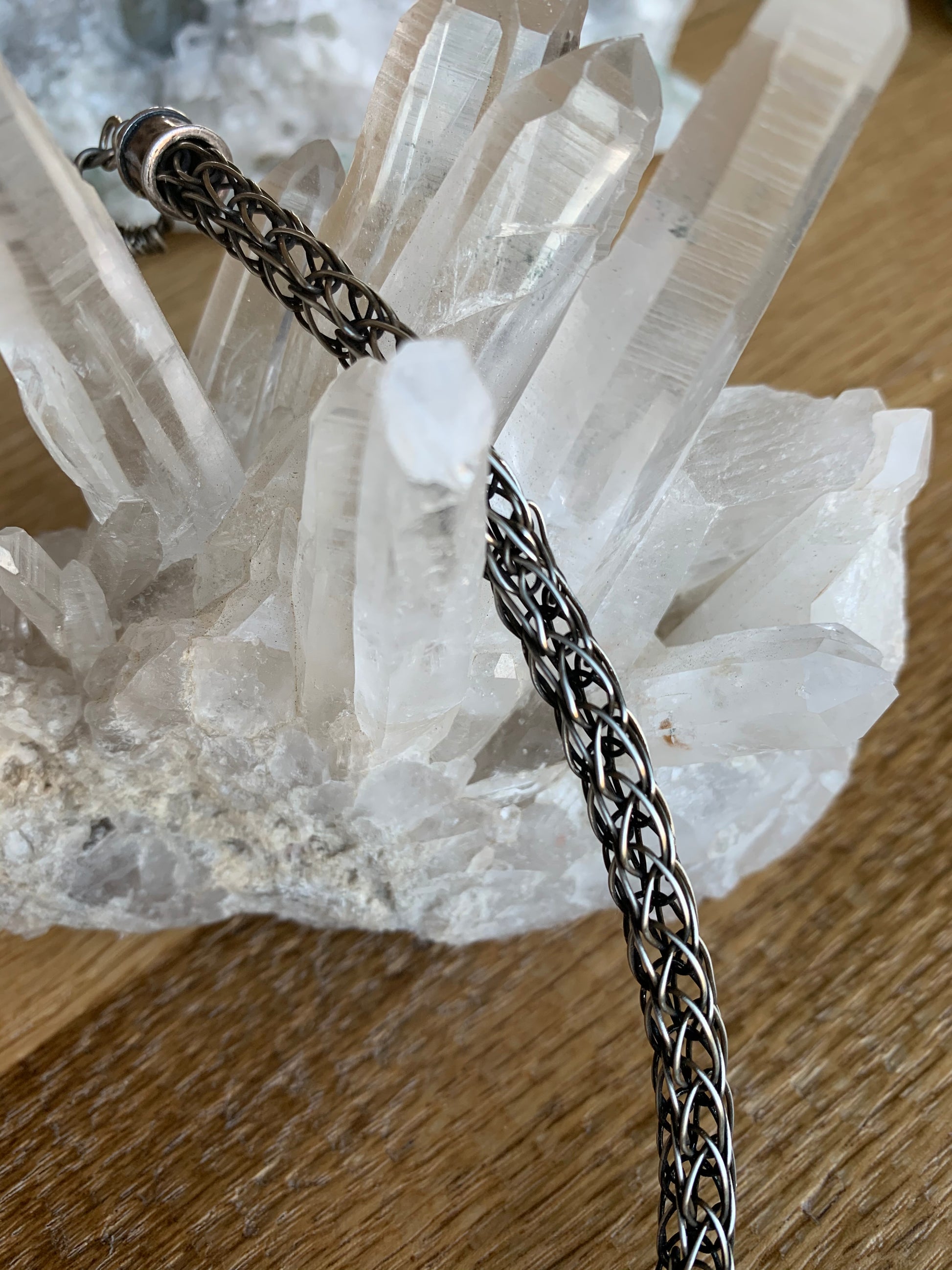 For this bracelet I wanted to create a design that had a bohemian flair with more of a current feel while celebrating and highlighting an ancient technique. I utilized this sterling silver knit chain, capped it in silver plated end caps and embellished it with a hand forged steel wire hook, a wire wrapped crystal quartz point, an arrow charm and a vintage opal charm. It is eye catching and full of fabulous texture and lovely dangly elements.
