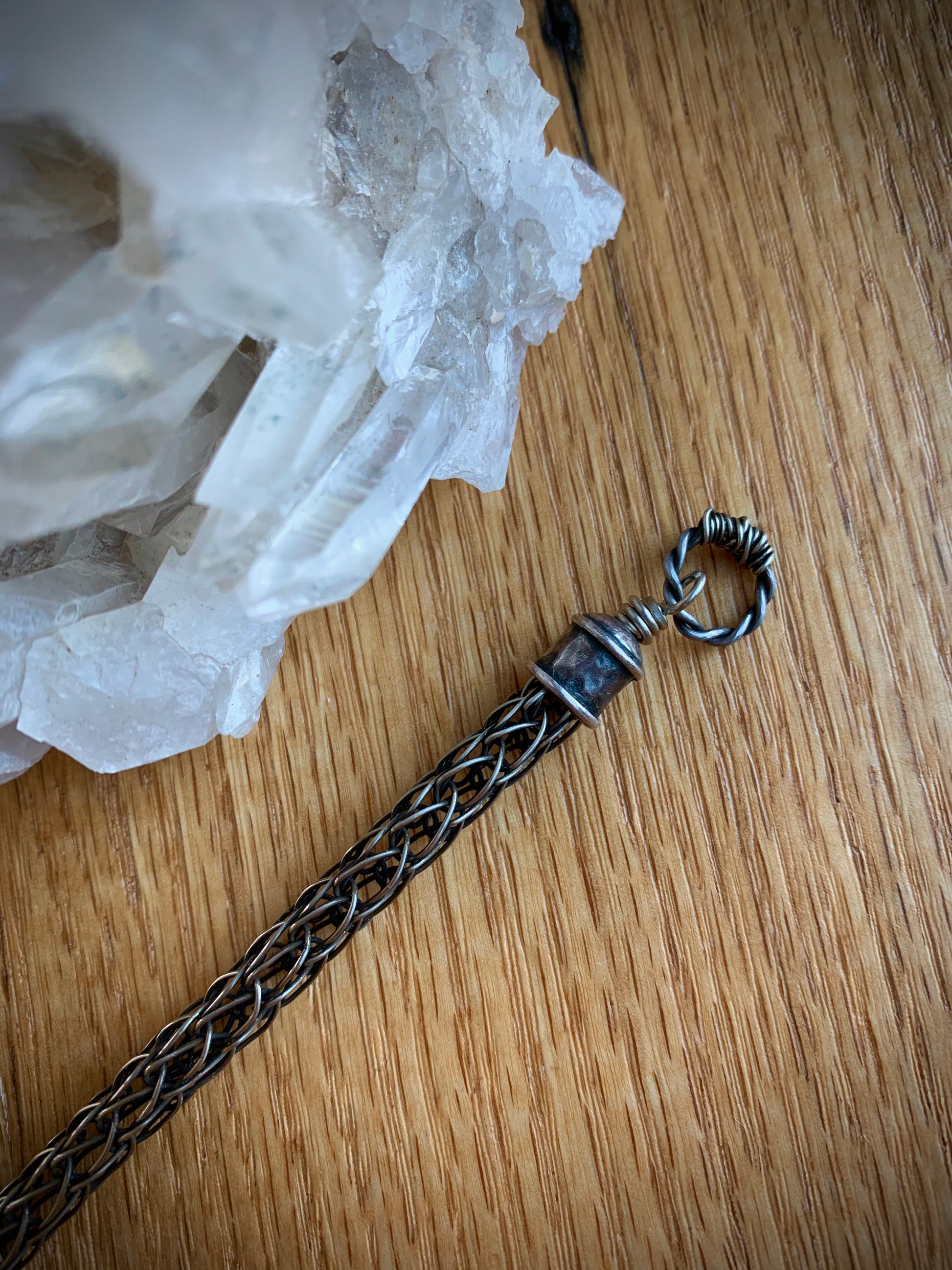 Viking knit is also known as Trichinopoly chain. The technique for making this kind of chain was known to and used by Viking Age Norse, but similar wire weaving has also been found in Greek, Roman, and Byzantine as far back as the 1st century BCE. The technique is essentially a weaving of wire in a circle tube like pattern and then pulled through a draw plate to elongate the design. Even though it is one continuous piece of wire, this technique creates a rather flexible and aesthetically dynamic design.