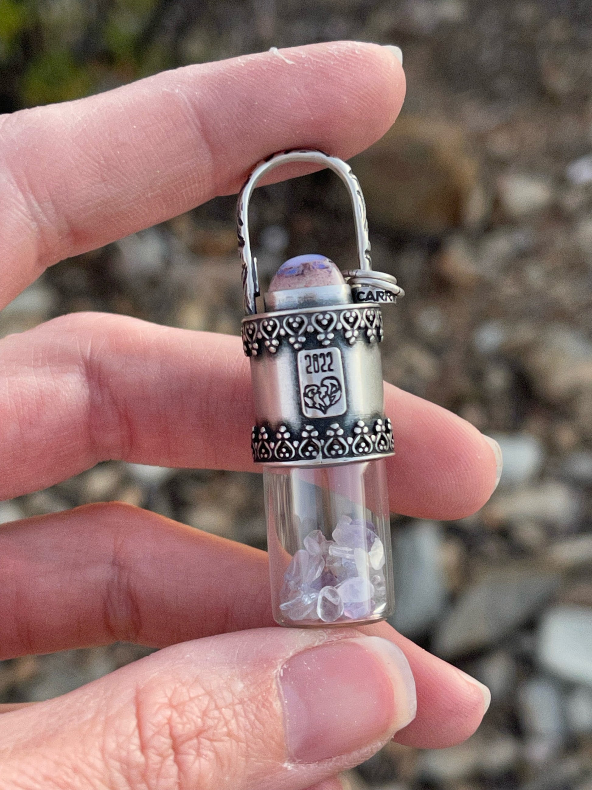This roller bottle pendant necklace is created from .925 sterling silver with a glass roller bottle and a gorgeous Cantera Opal (also known as a Mexican Fire Opal) on the top. The pendant comes with your choice of 18", 20", 24", or 30" sterling silver necklace.
