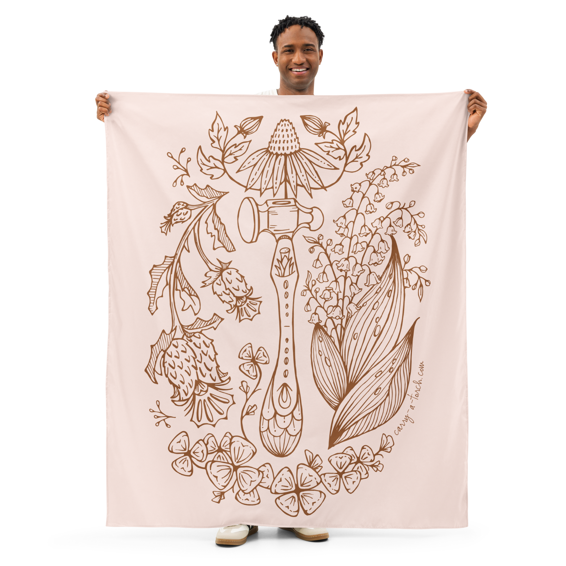 A Scandinavian folk art–inspired design by artist Shannon Bundschuh adorns the front, featuring her original Hammer drawing printed in a rich burnt orange over a soft blush pink. This tapestry is available in two sizes—26" × 36" (66 × 91.5 cm) and 50" × 62" (127 × 157.5 cm)—making it a versatile addition to your home, studio, or metalsmithing workspace.