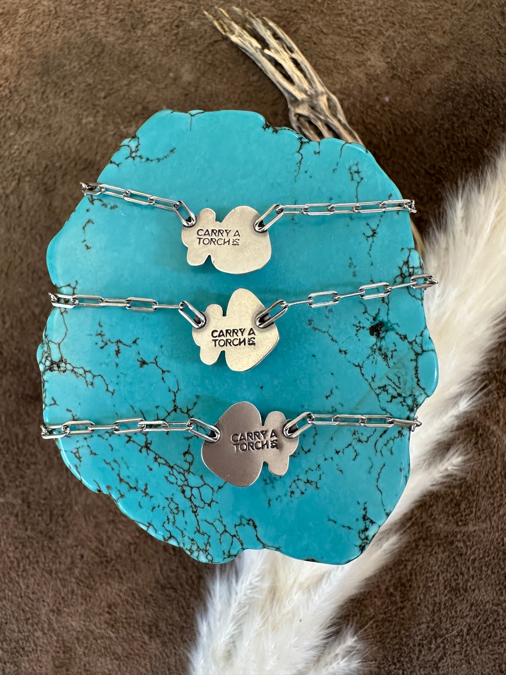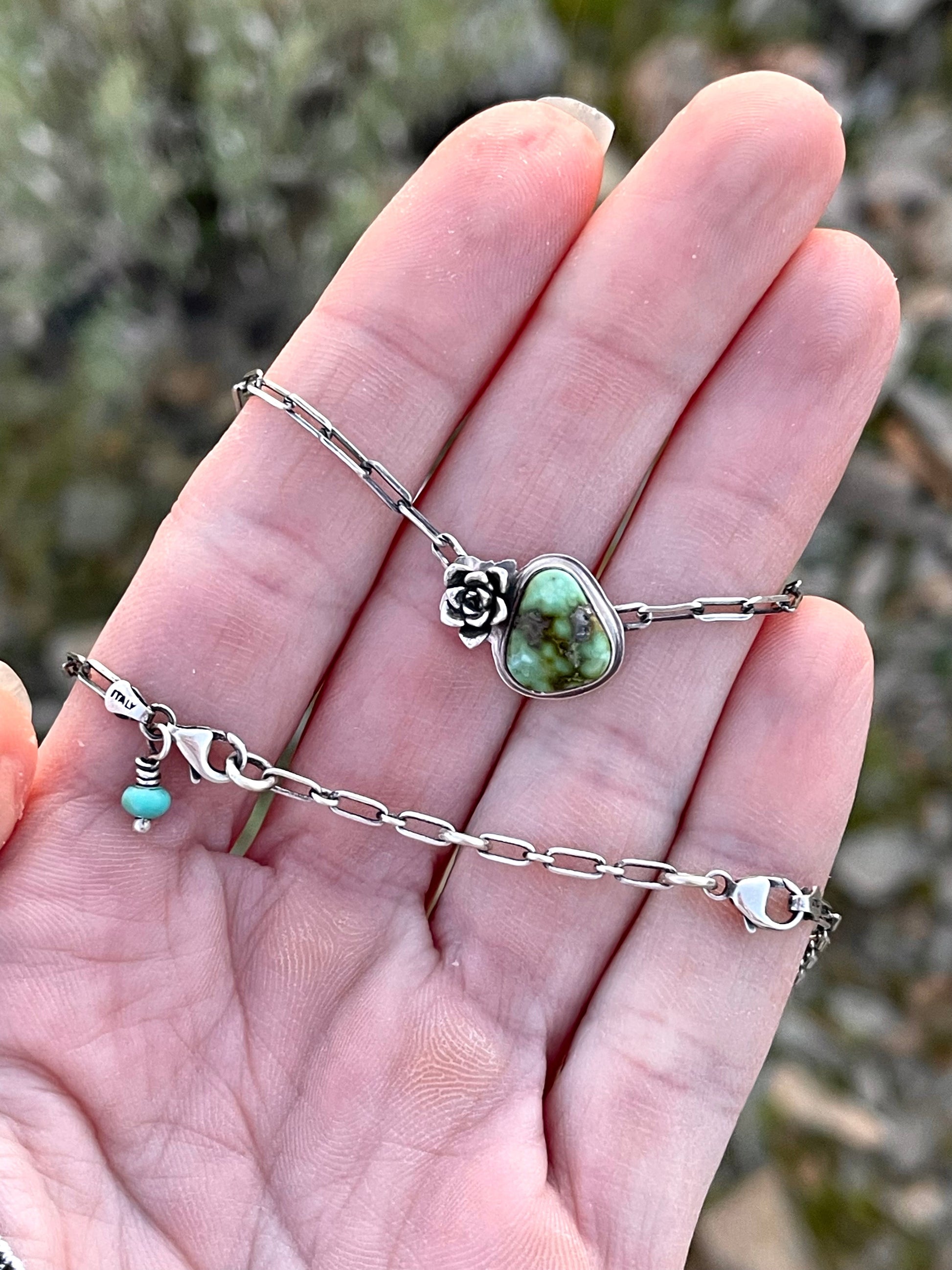 This tiny turquoise necklace is perfect for everyday wear. Its short length makes it ideal for layering or wearing alone. It sits comfortably right in the notch between the clavicle bones on your neck. The tiny sterling silver saguaro is nestled up close to a truly gorgeous triangle shaped Poseidon Variscite stone.