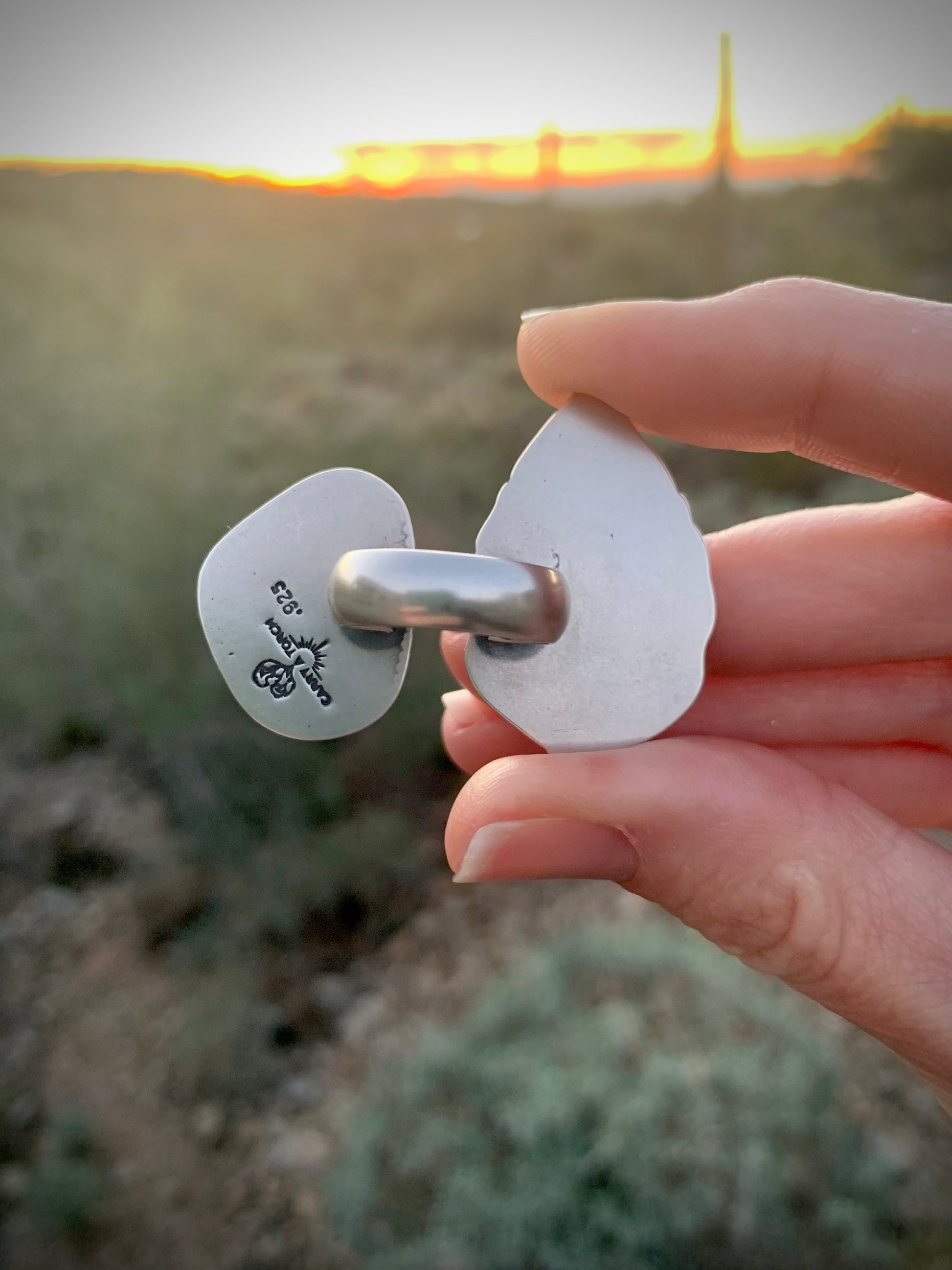 Earthy and unique. This bohemian split shank ring will surely start up many conversations. It is sized in a range due to its split nature. (There is a little wiggle room with sizing on this one.) A unique ring with two parts to the top instead of just one. It rests comfortably atop the space between your fingers while the band is around just the one central finger. The beauty of this design is that it won't spin around your finger like the weight of many statement pieces cause to happen. The design is versatile and will go with most everything from classic white tee to boho chic.