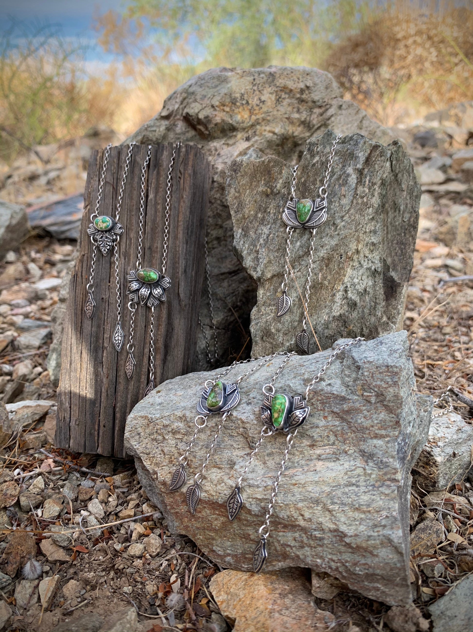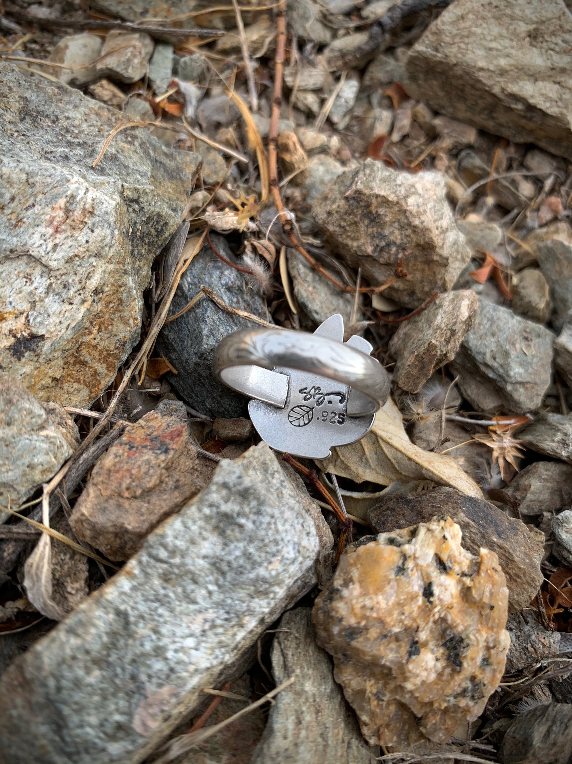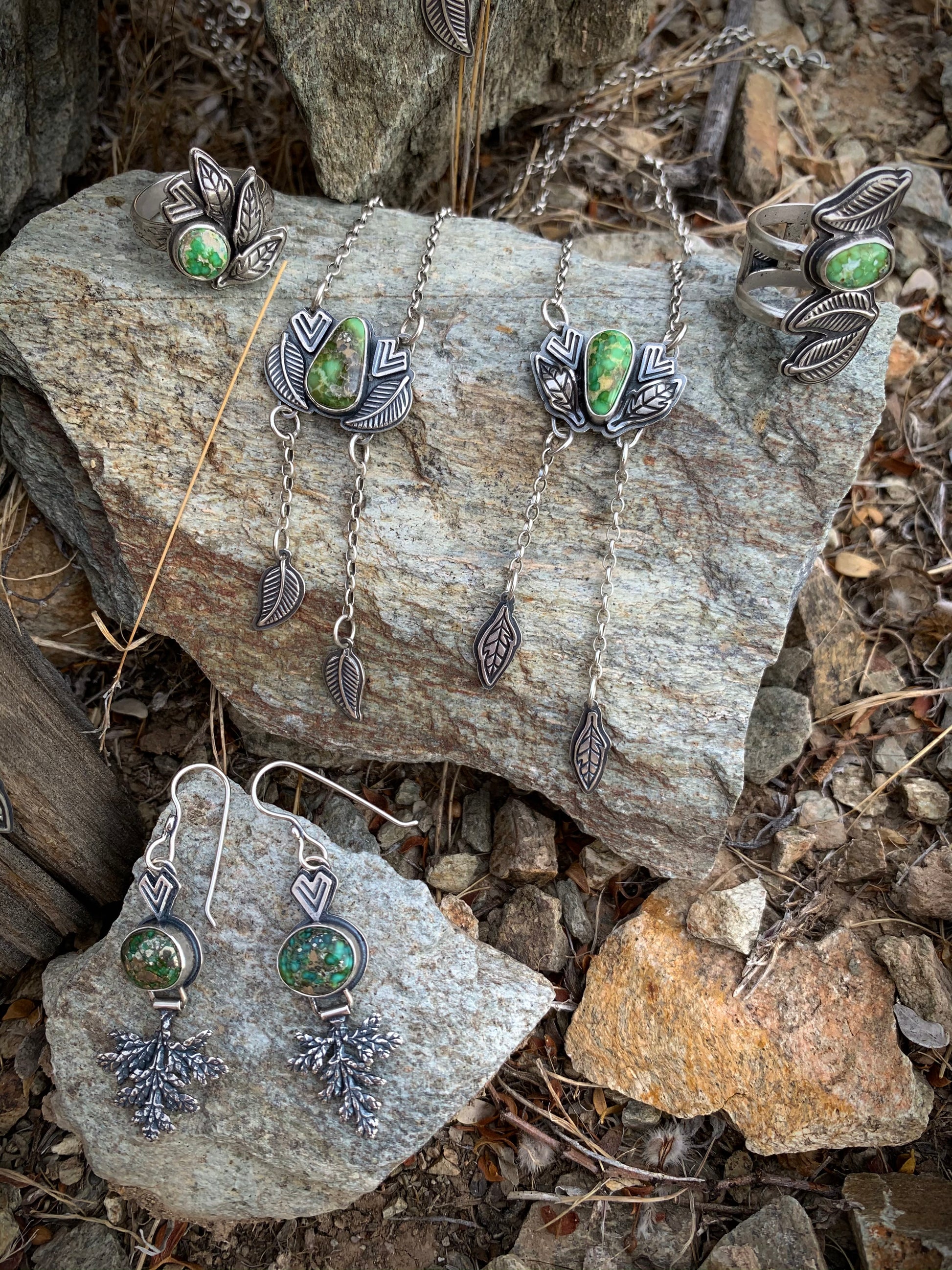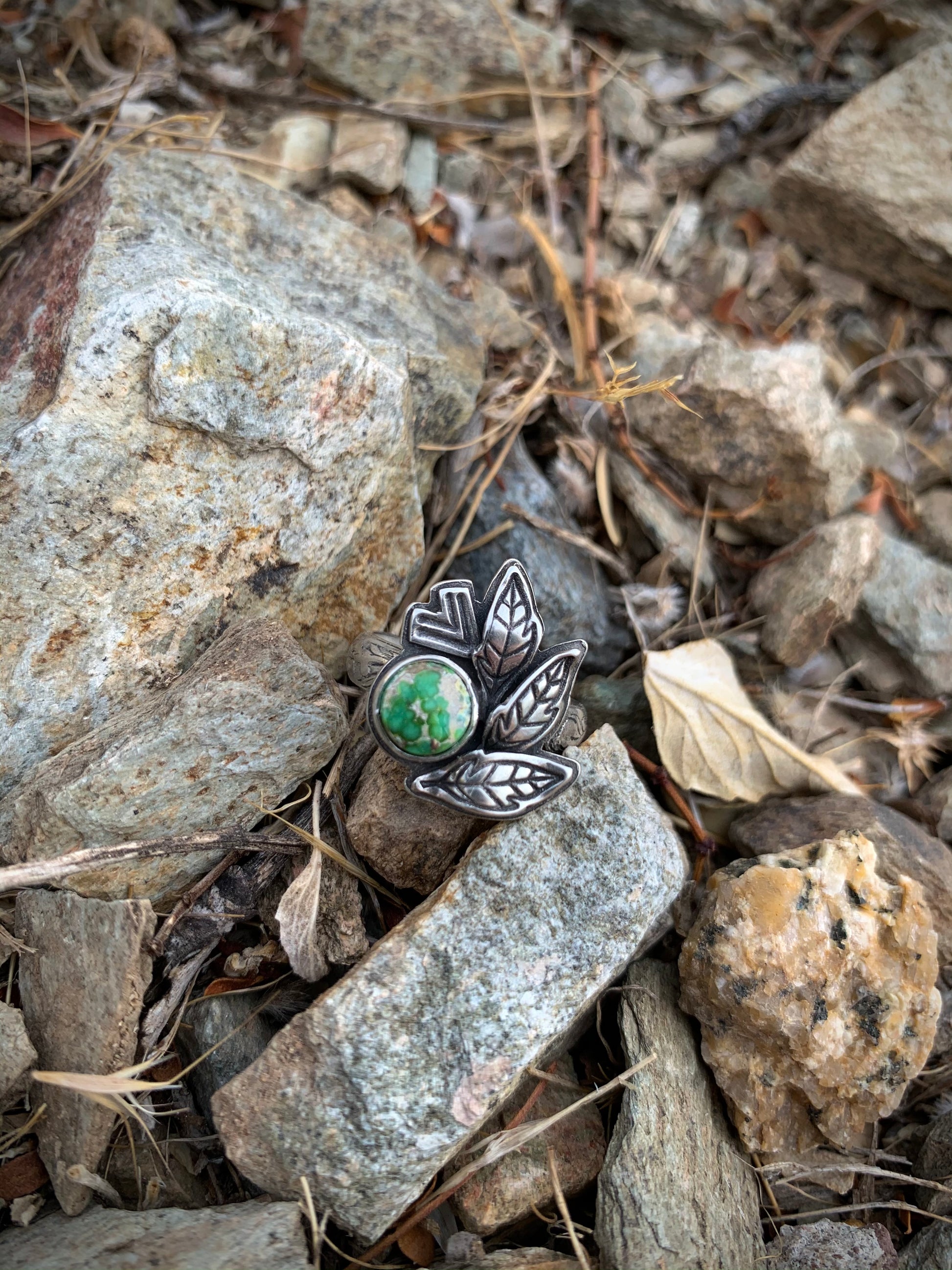 A small round Sonoran Gold turquoise nestles itself amongst a cluster of leaves in this sweet botanical ring.