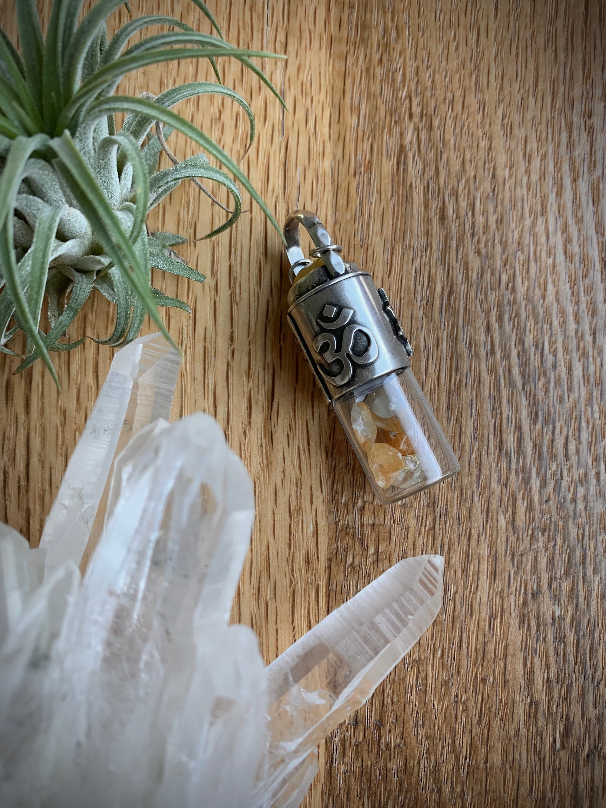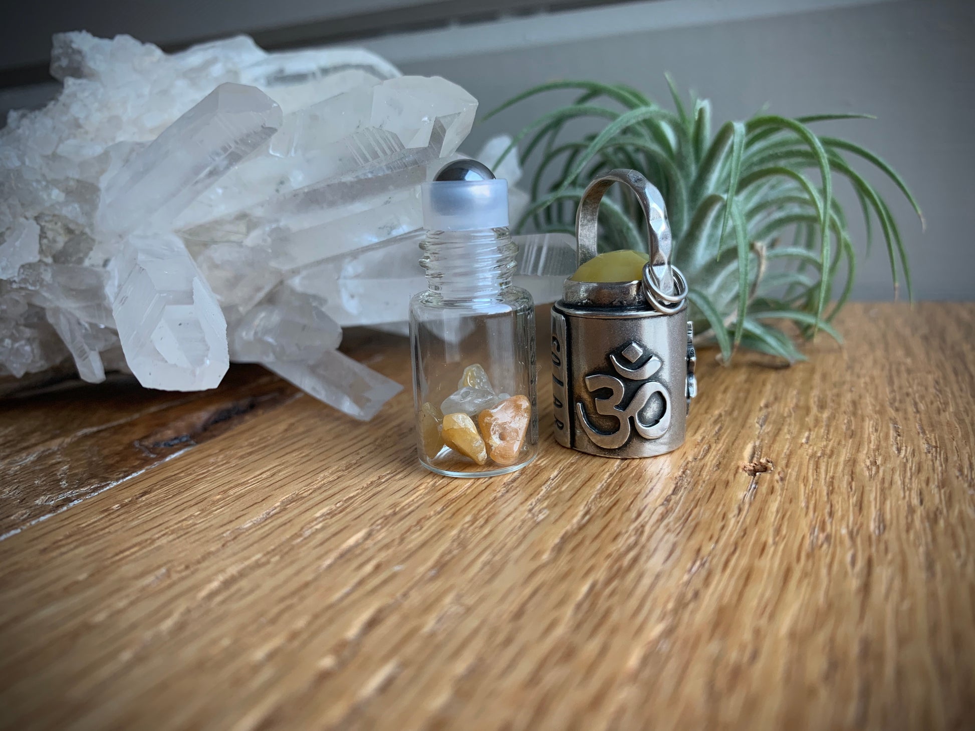This sterling silver cap atop a 2ml roller bottle was metalsmithed by me and adorns the symbol of the individual chakra, the stamped name of the chakra, and a hand-sawed OM symbol. So any way your bottle turns while you wear it, you will have a design showing. Each bottle is topped with a gemstone. Incased in the bottle are additional stones to infuse their properties into your chosen oils.