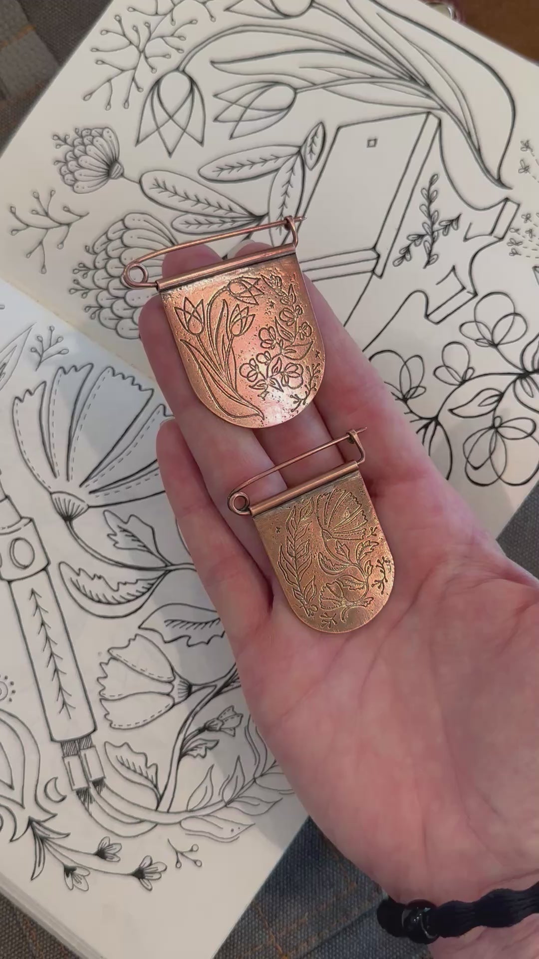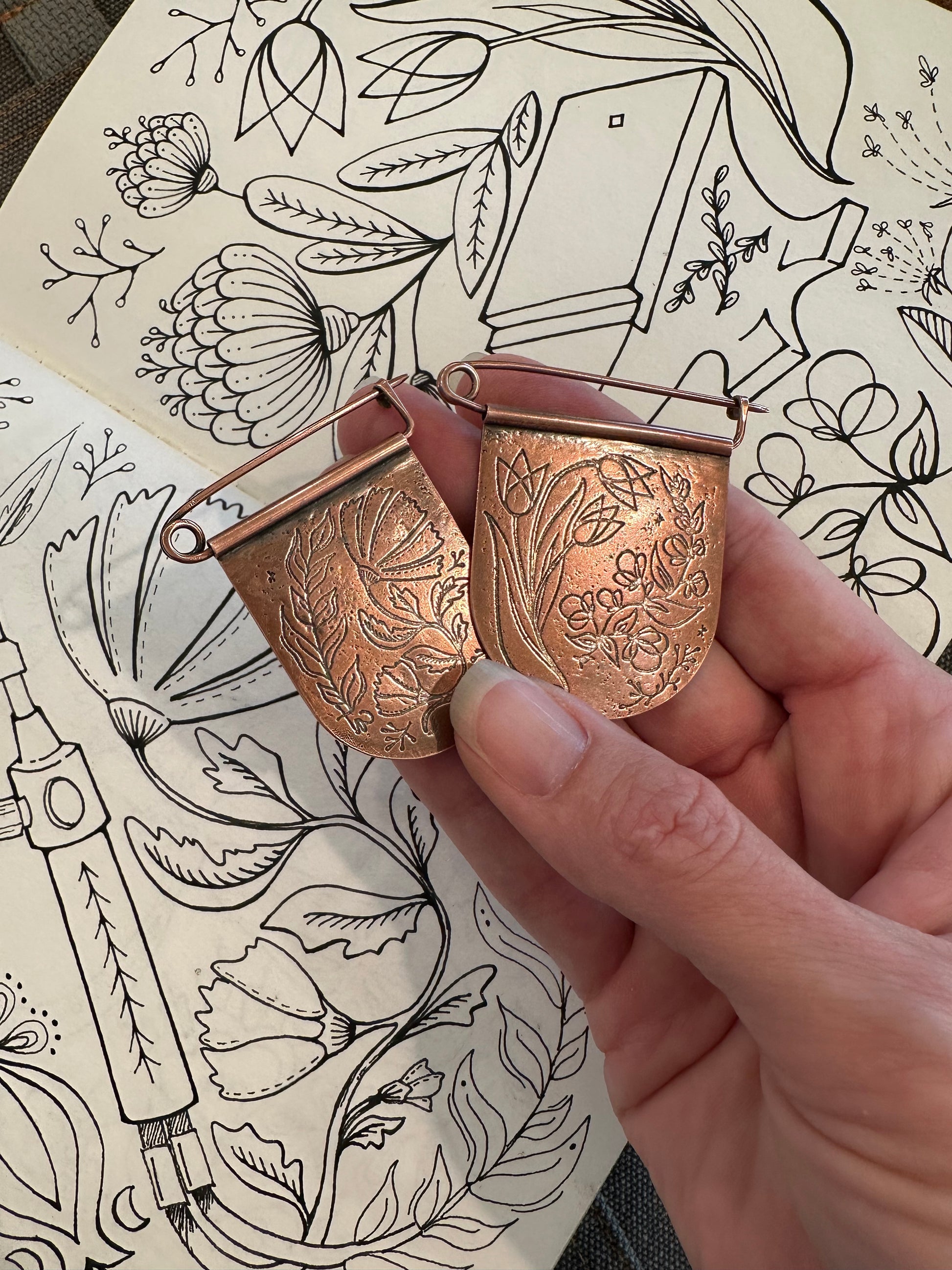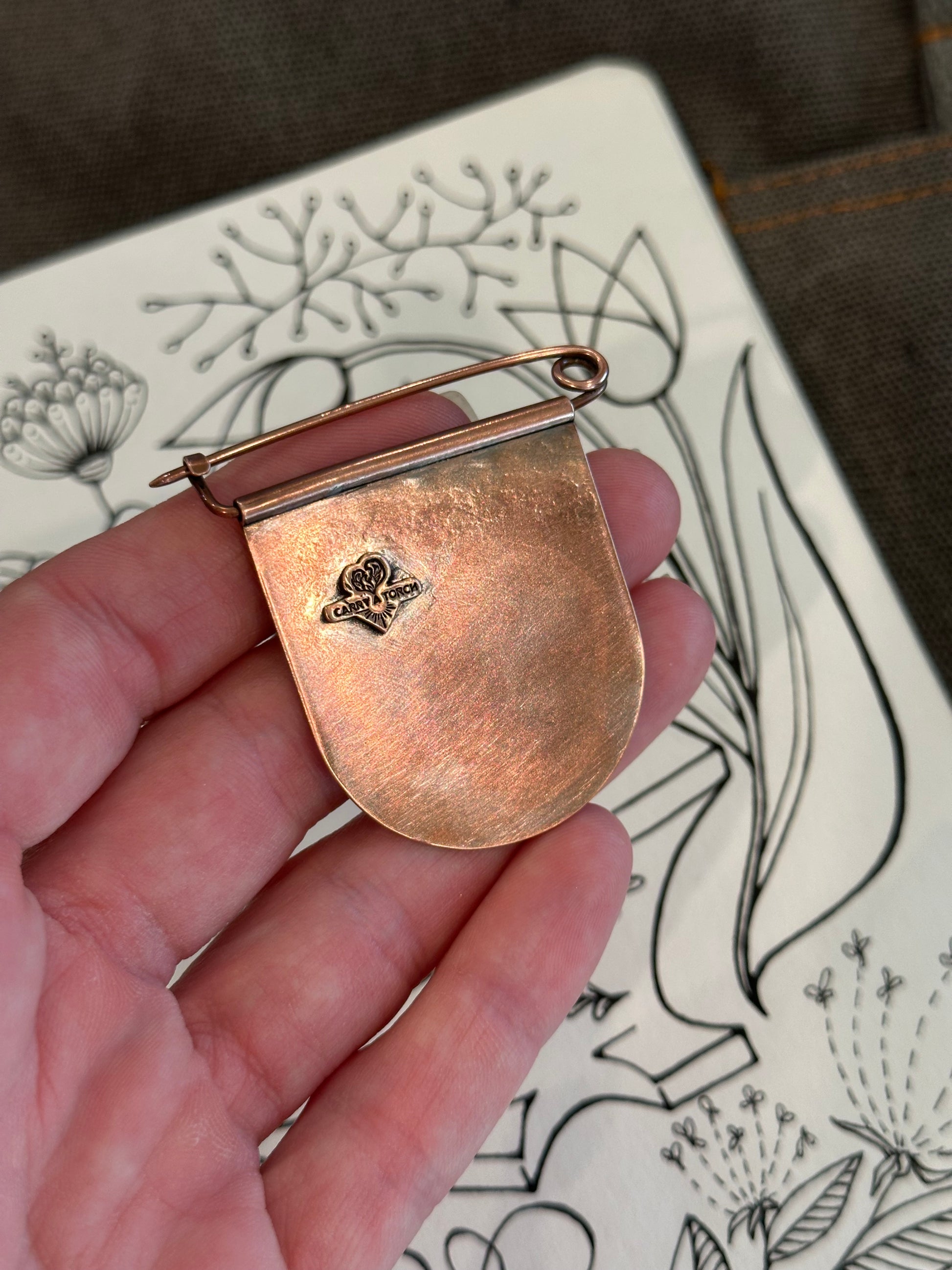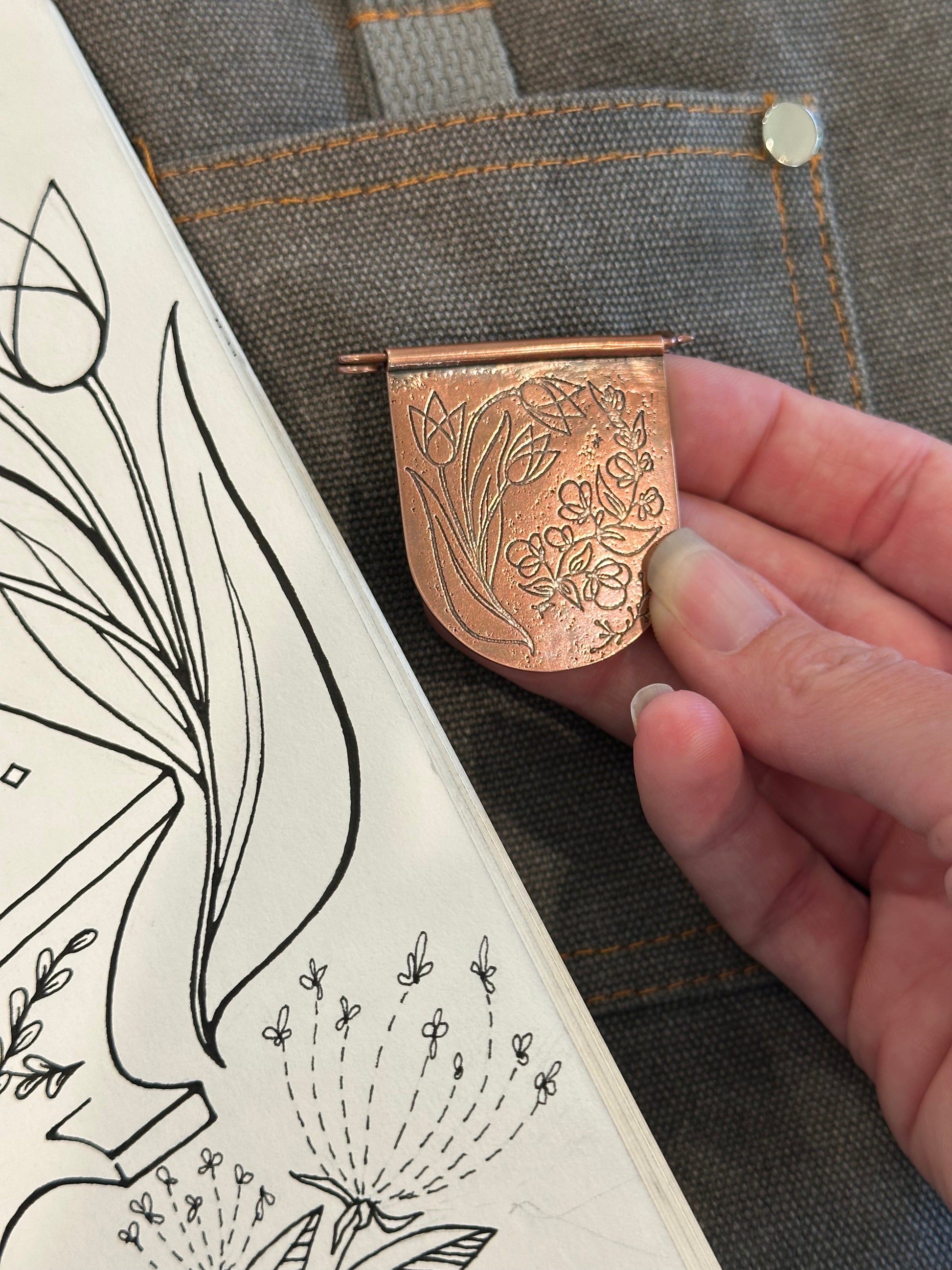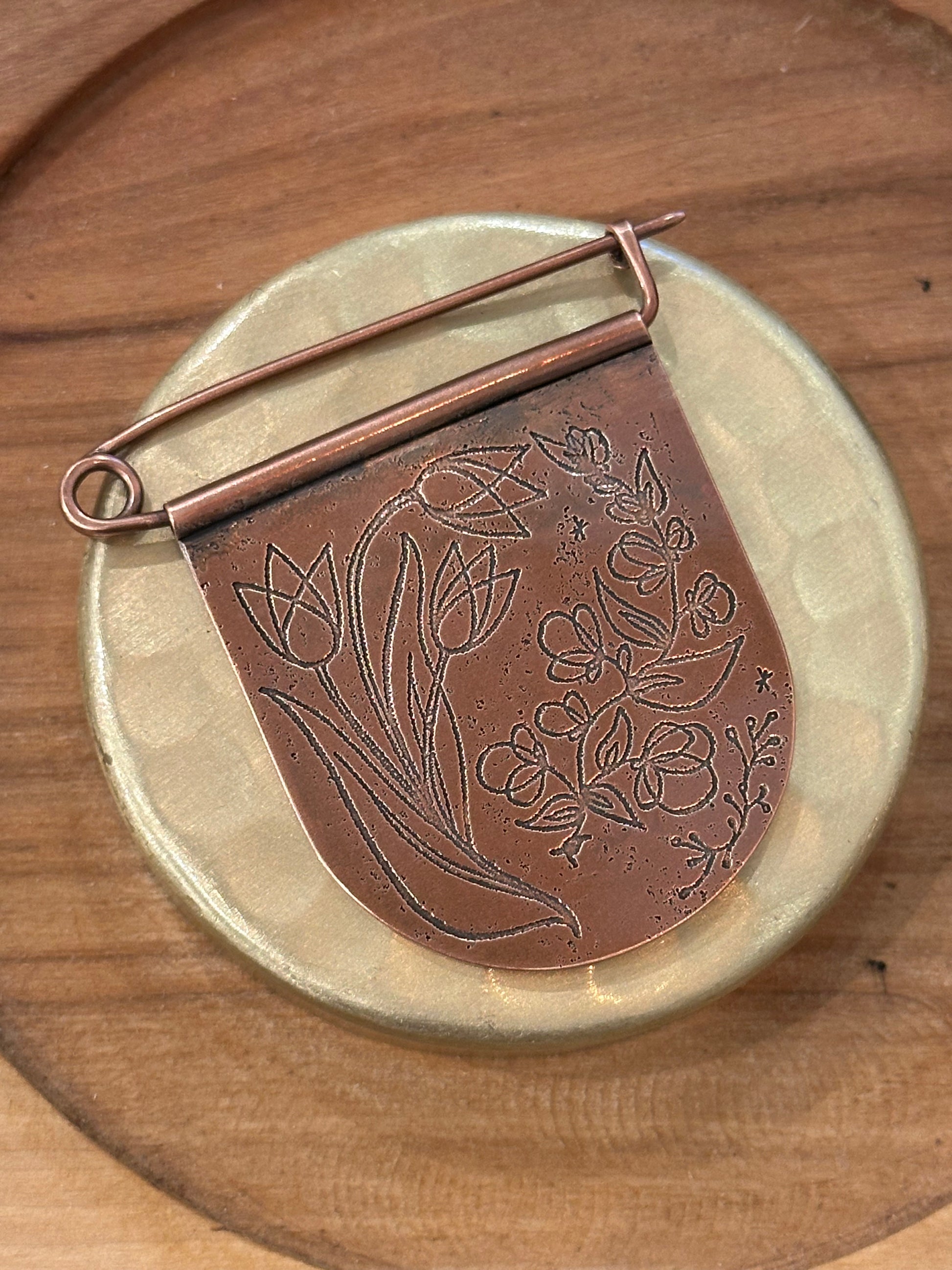 This copper tulip brooch brings a playful botanical story to life. The design is based on one of my original hand-drawn illustrations and etched directly into the copper. A graceful tulip bouquet is paired with a whimsical swirl of wildflowers, tiny stars, and leaves — like a bloom plucked from a folk-art fairytale.