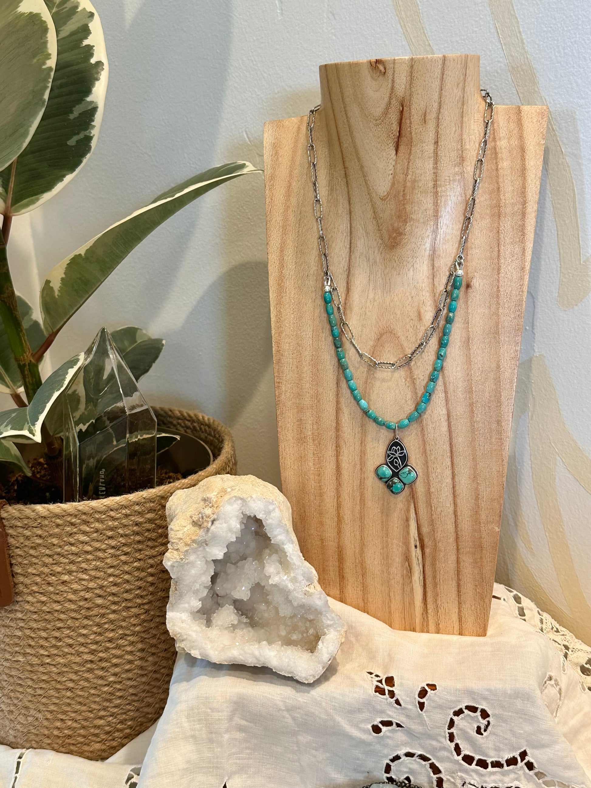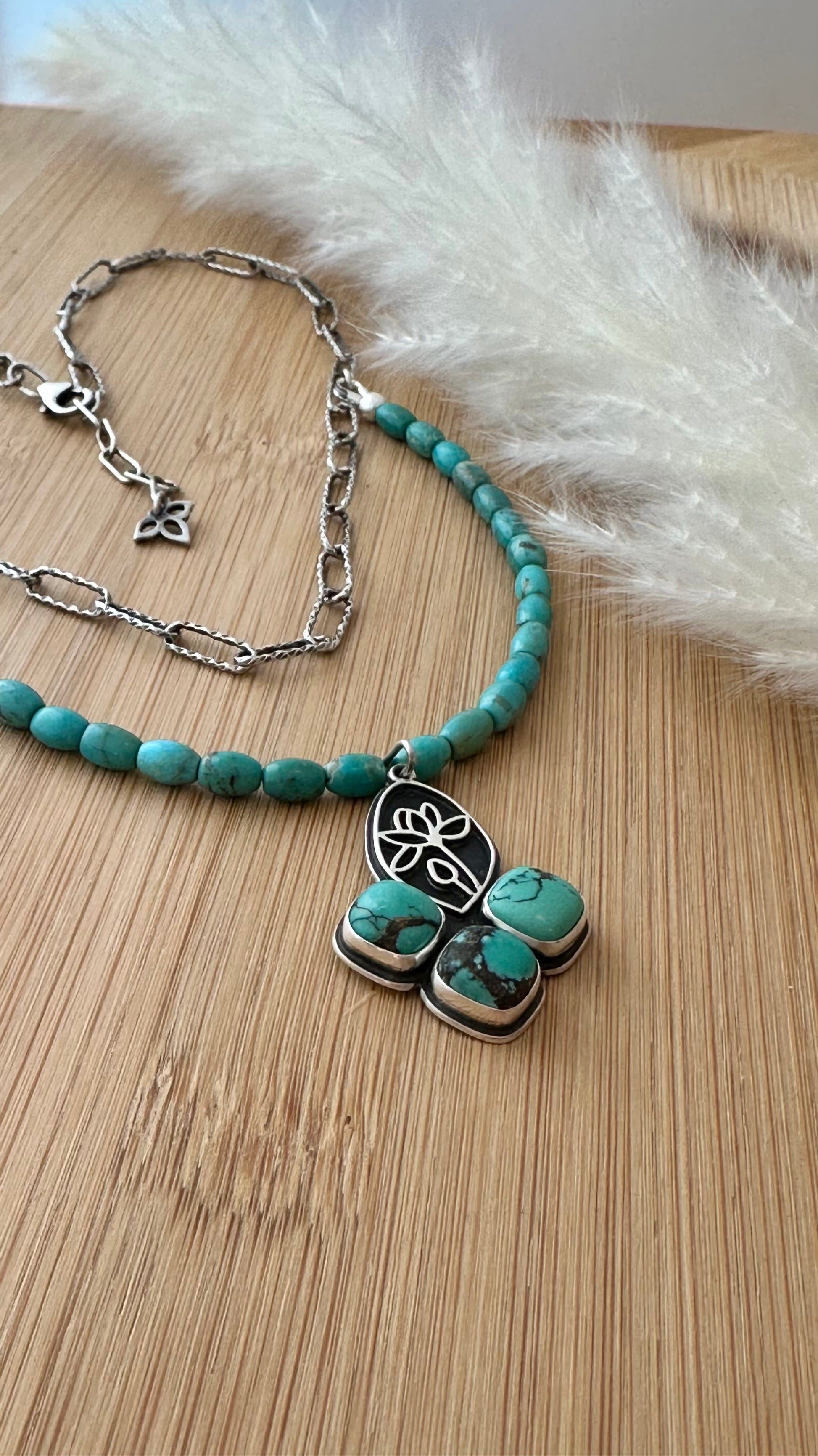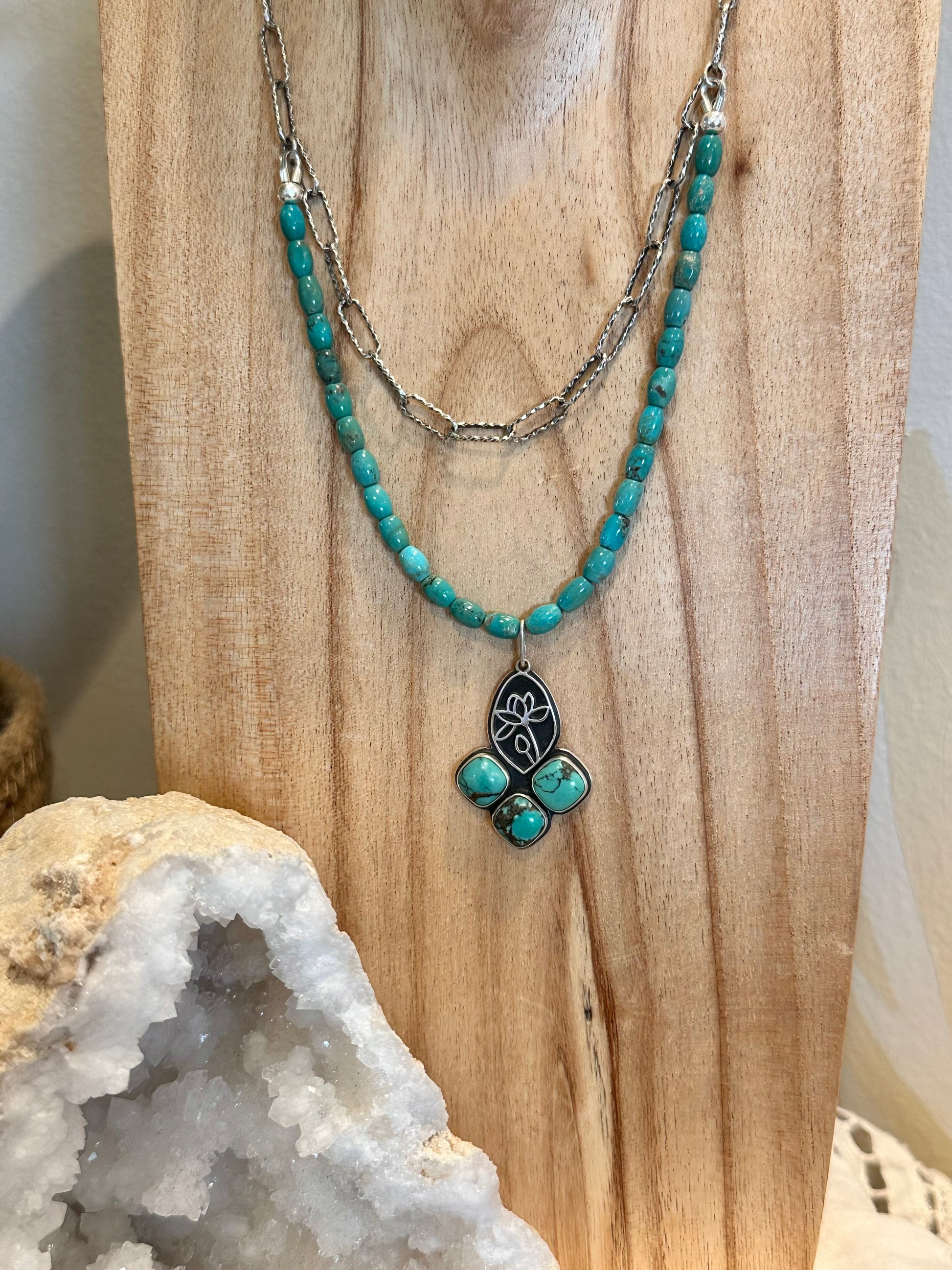 The pendant hangs from a strand of Elisa turquoise beads that is attached to an oxidized paperclip chain giving the necklace a layered look. The paperclip chain allows the necklace to be worn shorter or longer depending on desired length. The very end of the chain has a 3 petal lotus accent.