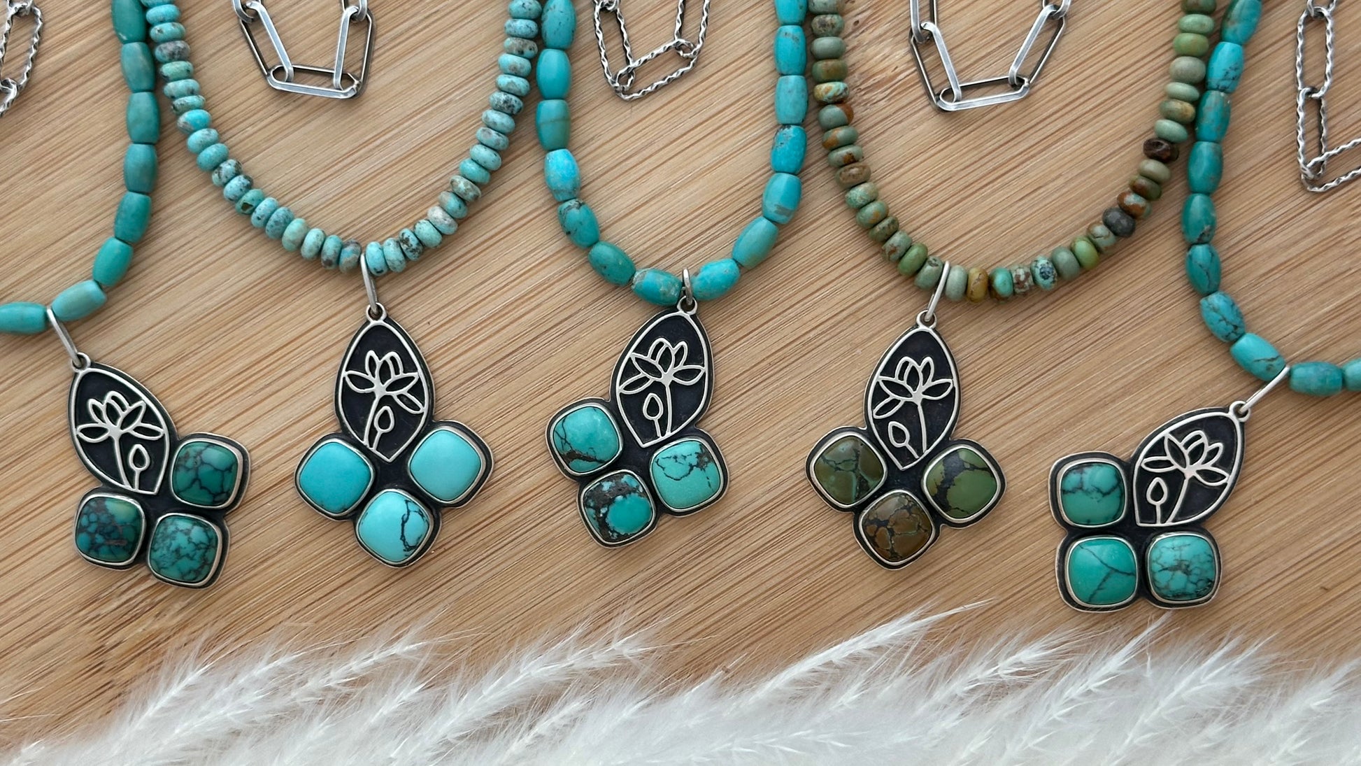 This Layered Lotus Necklace with 3 Hubei Turquoise stones was created with intention and meaning. The lotus flower is said to represent the ability to grow, blossom and bloom in the midst of chaos, suffering and pain. It's a symbol of strength and perseverance as well as new beginnings and rebirth. The number 3 is often seen as a symbol of balance, harmony, and completeness, representing the union of mind, body, and spirit. There is beauty in change. You can grow from this.