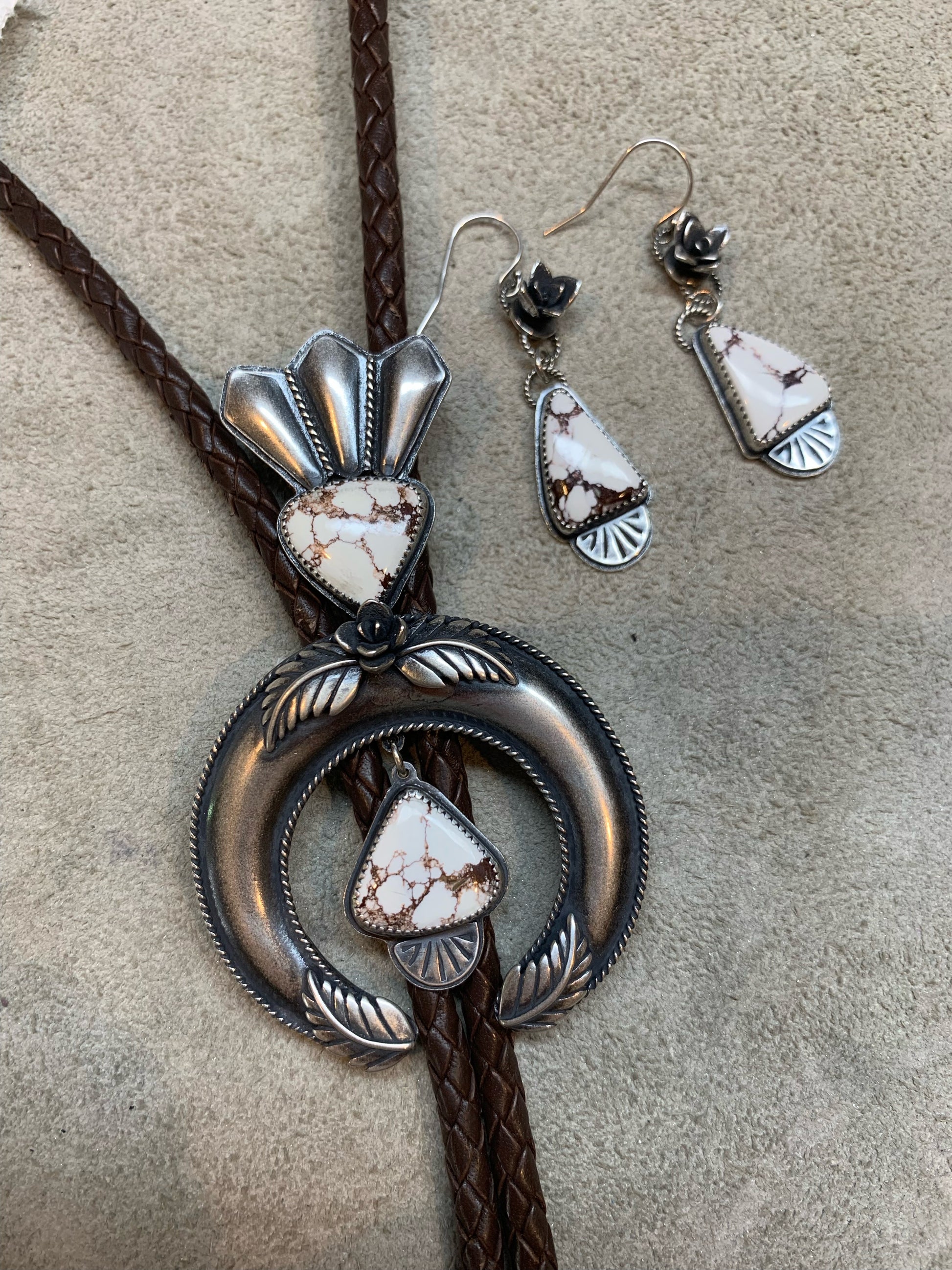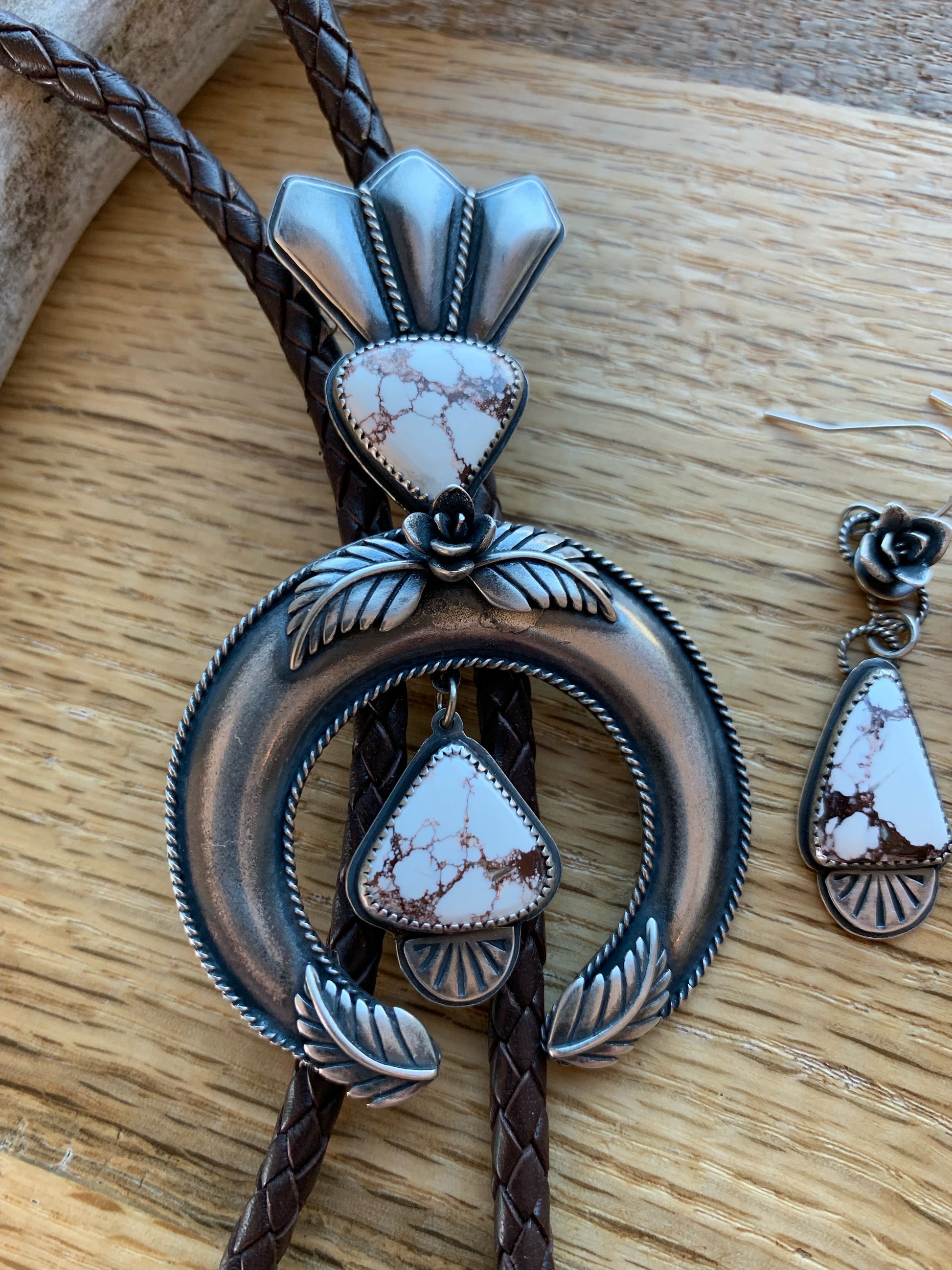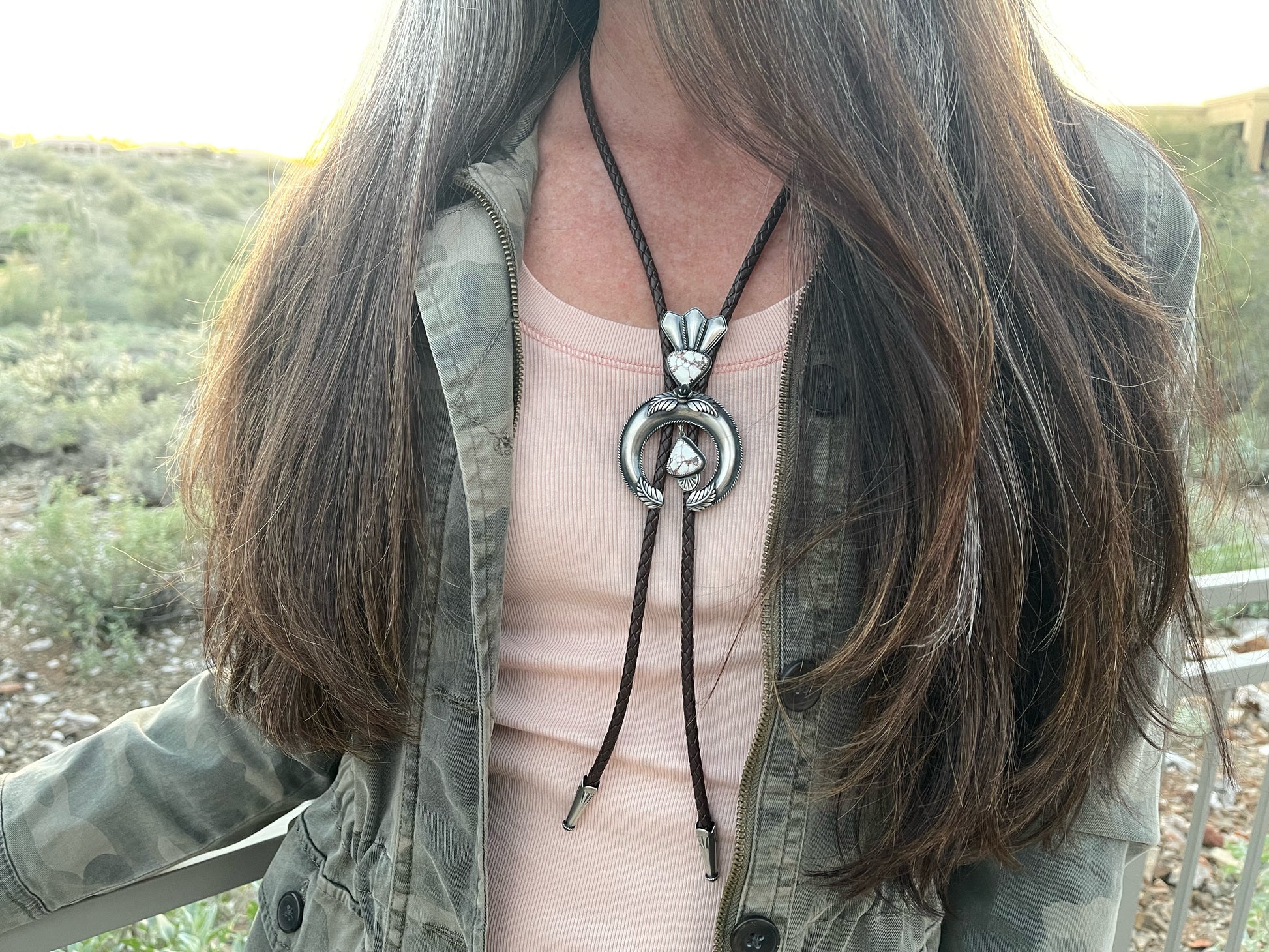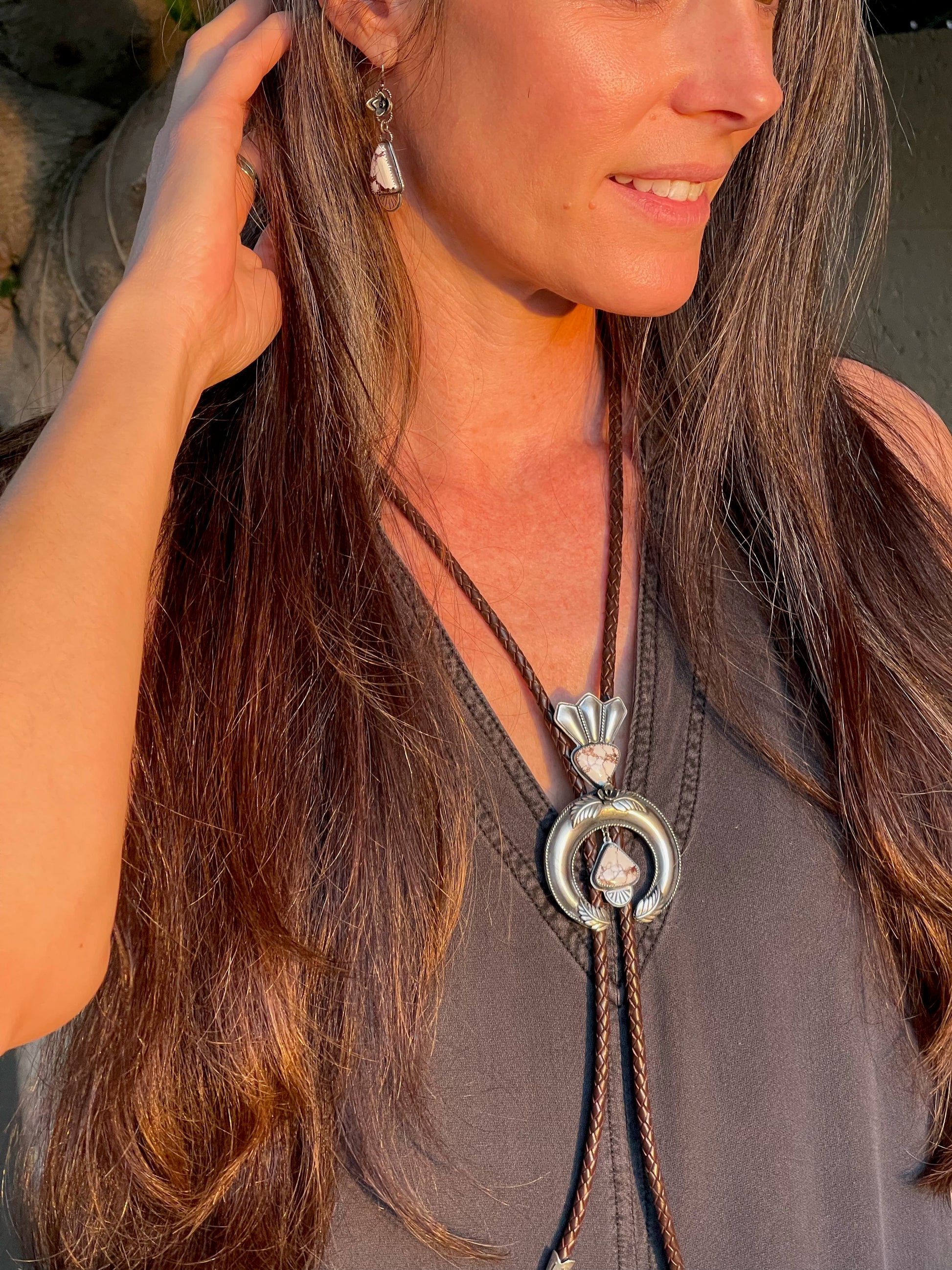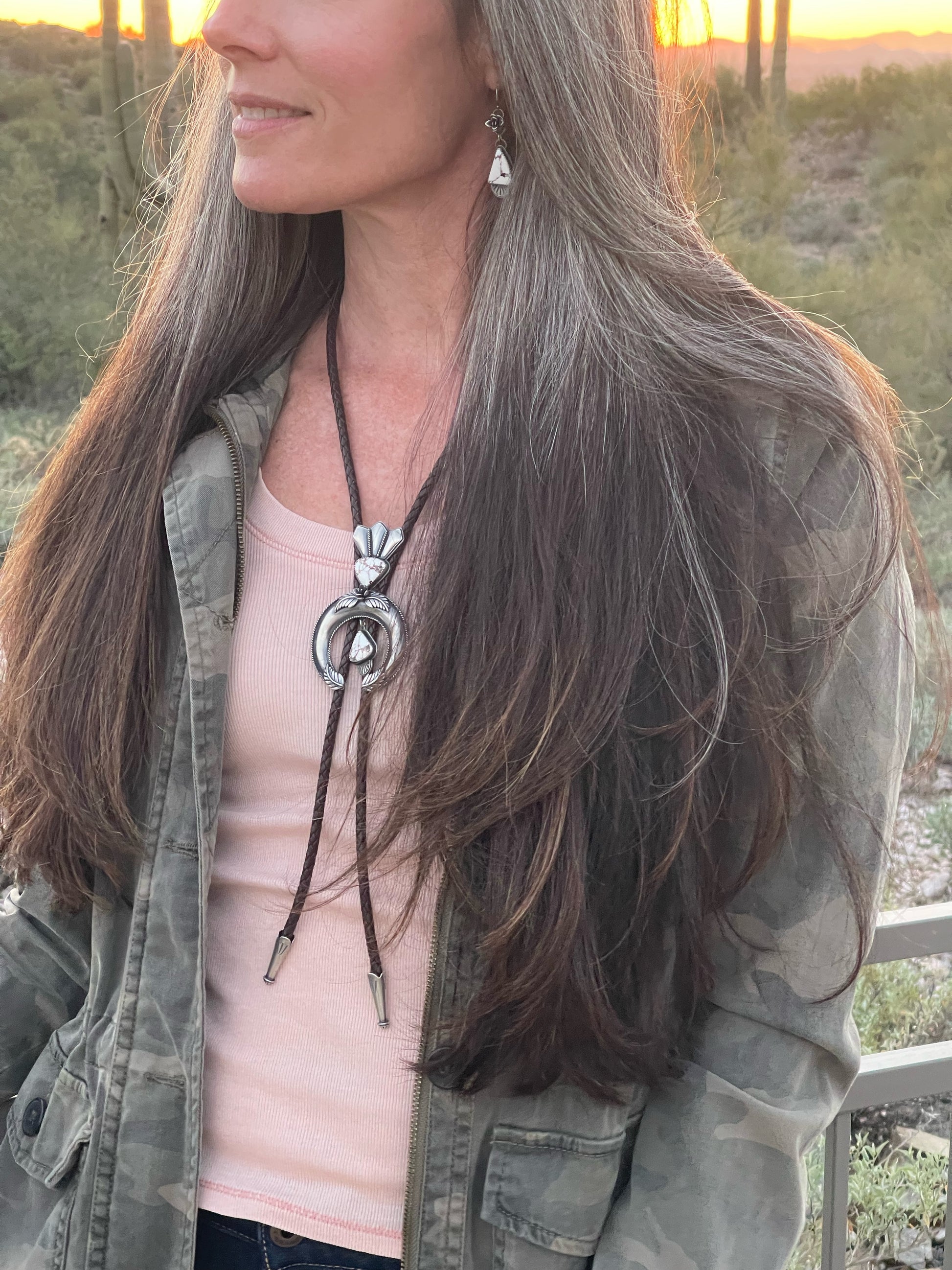 I have always loved the design of the squash blossom necklaces and wanted to create a version of my own. This bolo tie began as me just learning the process of creating a naja and building off of the horseshoe or crescent shape. The added stones are Wild Horse Magnesite which is mined in Arizona so I felt it was a fitting stone to accompany this southwestern design. It is finished off with a dark brown leather woven cord and bolo tips.