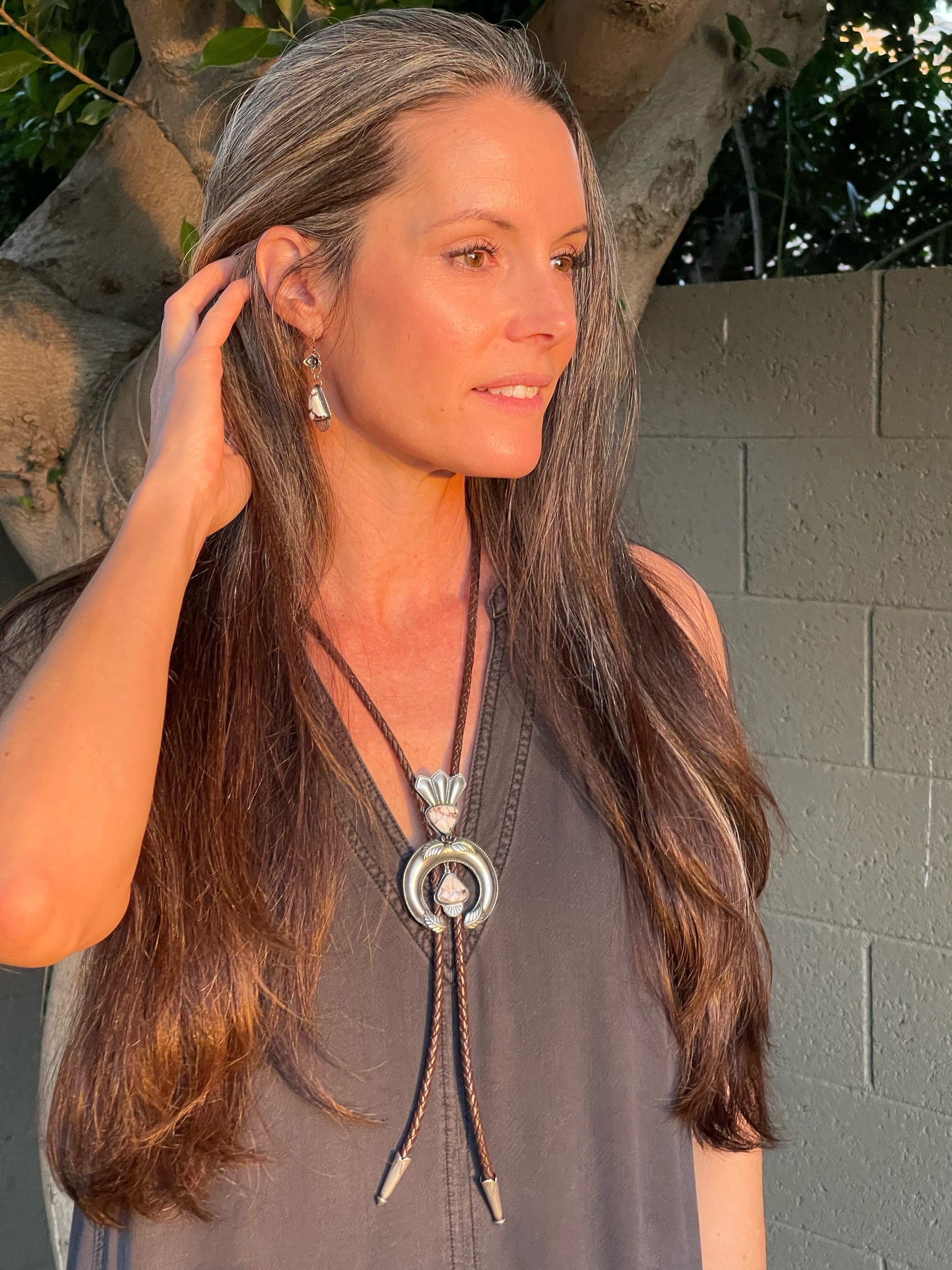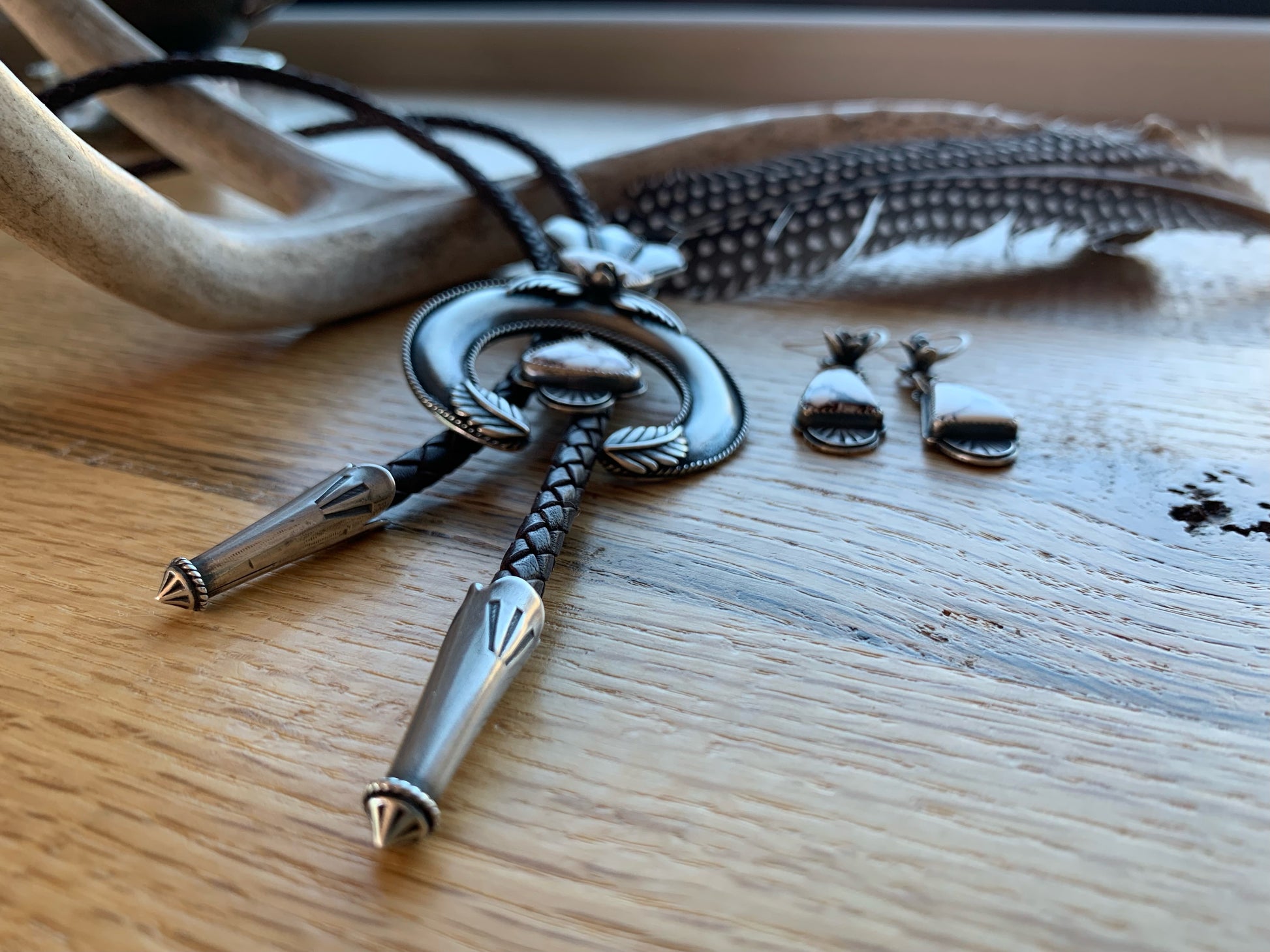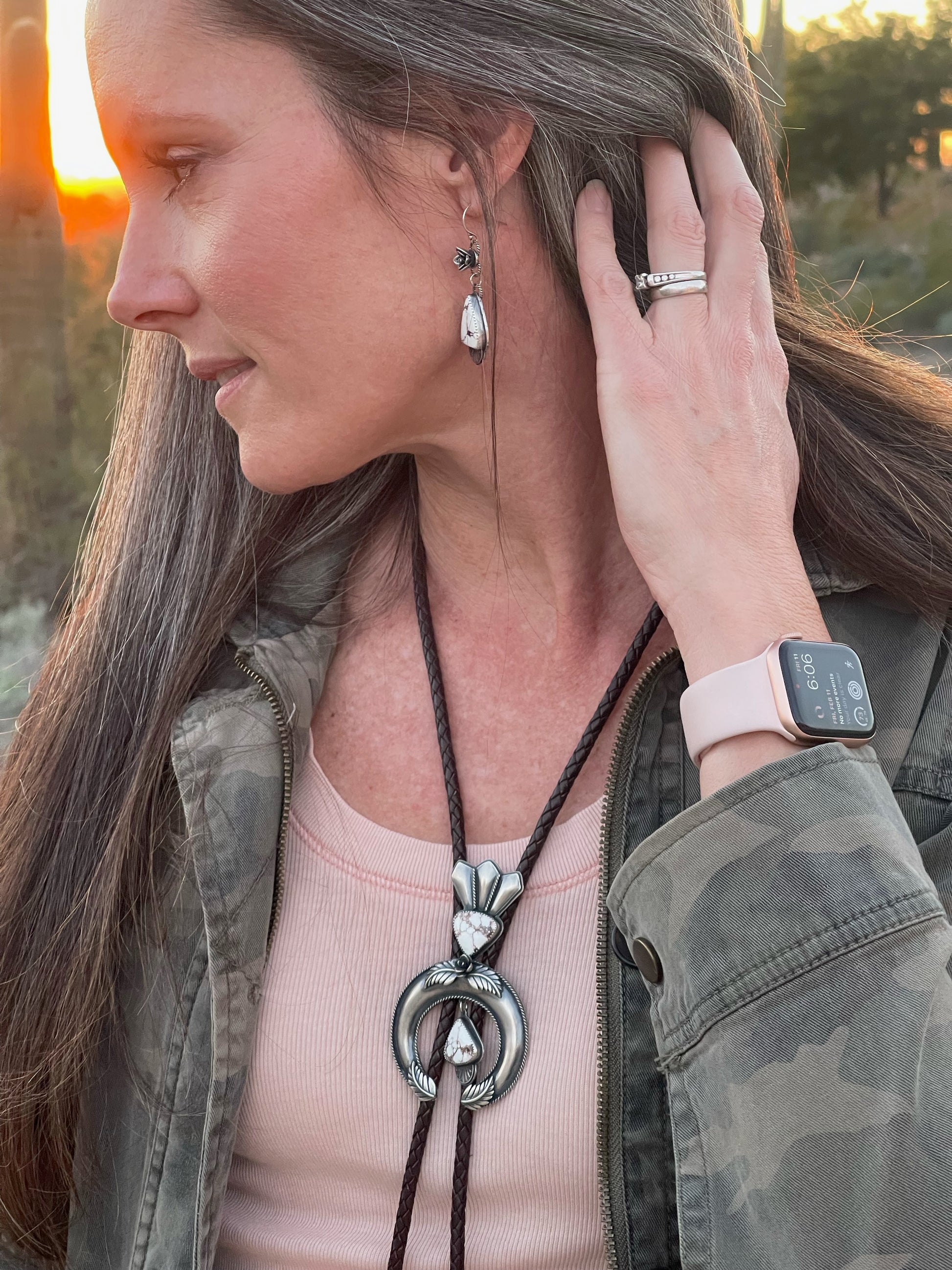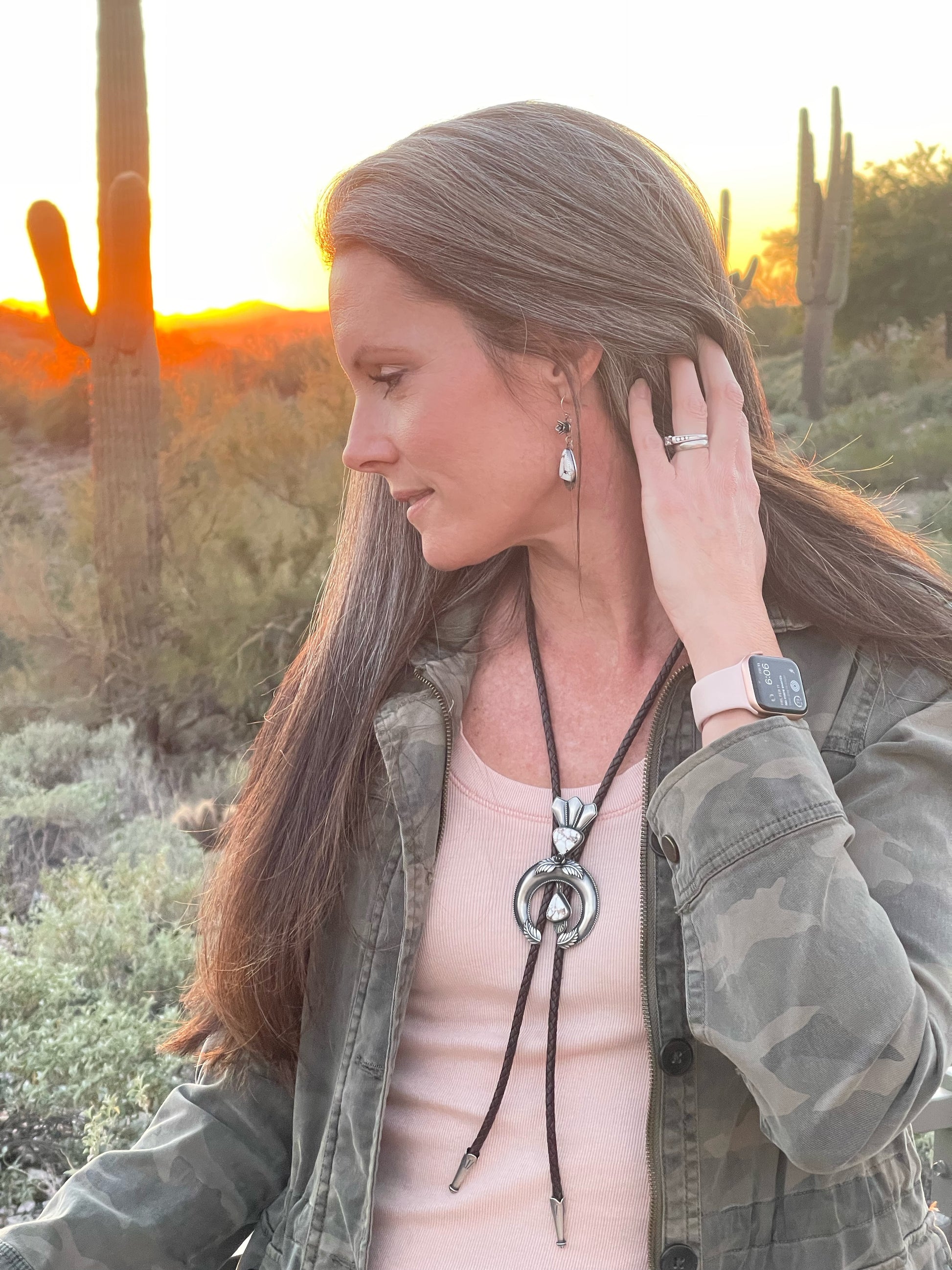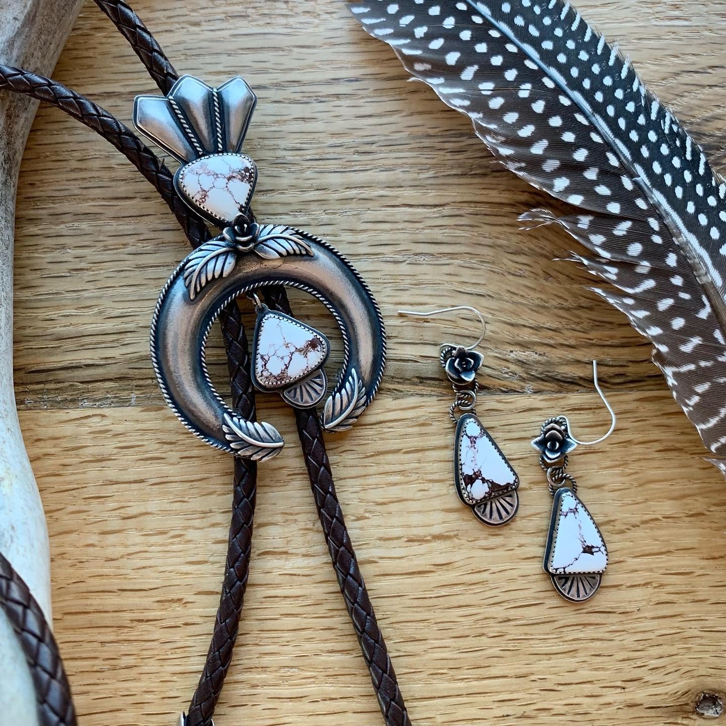I have always loved the design of the squash blossom necklaces and wanted to create a version of my own. This bolo tie began as me just learning the process of creating a naja and building off of the horseshoe or crescent shape. The added stones are Wild Horse Magnesite which is mined in Arizona so I felt it was a fitting stone to accompany this southwestern design. It is finished off with a dark brown leather woven cord and bolo tips.